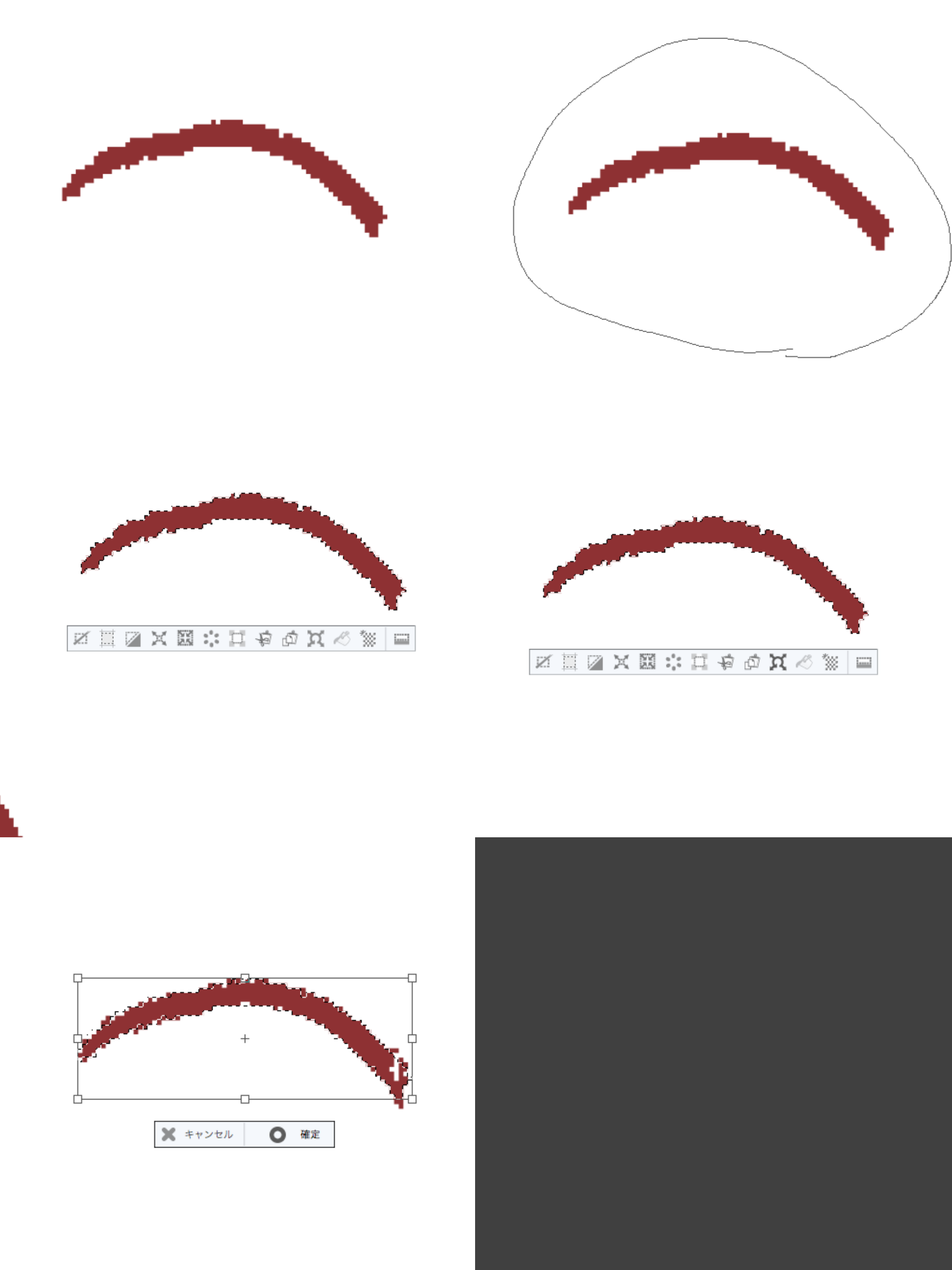 CLIP STUDIO PAINT上で、ベクターレイヤーのみですが投げ縄で範囲を選択してから「拡大・縮小・回転」をすると、選択したものが全て選択されずに、一部だけ選択されてしまいます。 違うもの、違うレイヤー、違うファイルでも同様のことが起きており、いろいろ試したのですが解決しないので、参考に経緯の画像を添付しておきますので、対応よろしくお願いします。 (左上から1・2、2段目に3・4、3段目に5という形です。) )------------------------------------------------------------ ■バージョン: ※Windowsは、[ヘルプ]メニュー → [バージョン情報]で確認できます。 ※MacOSXは、[CLIP STUDIO PAINT]メニュー → [バージョン情報]で確認できます。 ※iPadは、[CLIP STUDIO PAINT]アイコン → [バージョン情報]で確認できます。 ■グレード DEBUT( ) PRO( ○ ) EX( ) ■OS Windows XP( ) Windows Vista( ) Windows 7 ( ) Windows 8( ) Windows 8.1( ) Windows 10( ) MacOS X 10.5( ) MacOS X 10.6( ) MacOS X 10.7( ) MacOS X 10.8( ) MacOS X 10.9( ) MacOS X 10.10( ) MacOS X 10.11( ) mac OS 10.12( ) mac OS 10.13( ○ ) iOS 11( ) その他( ) ------------------------------------------------------------ |