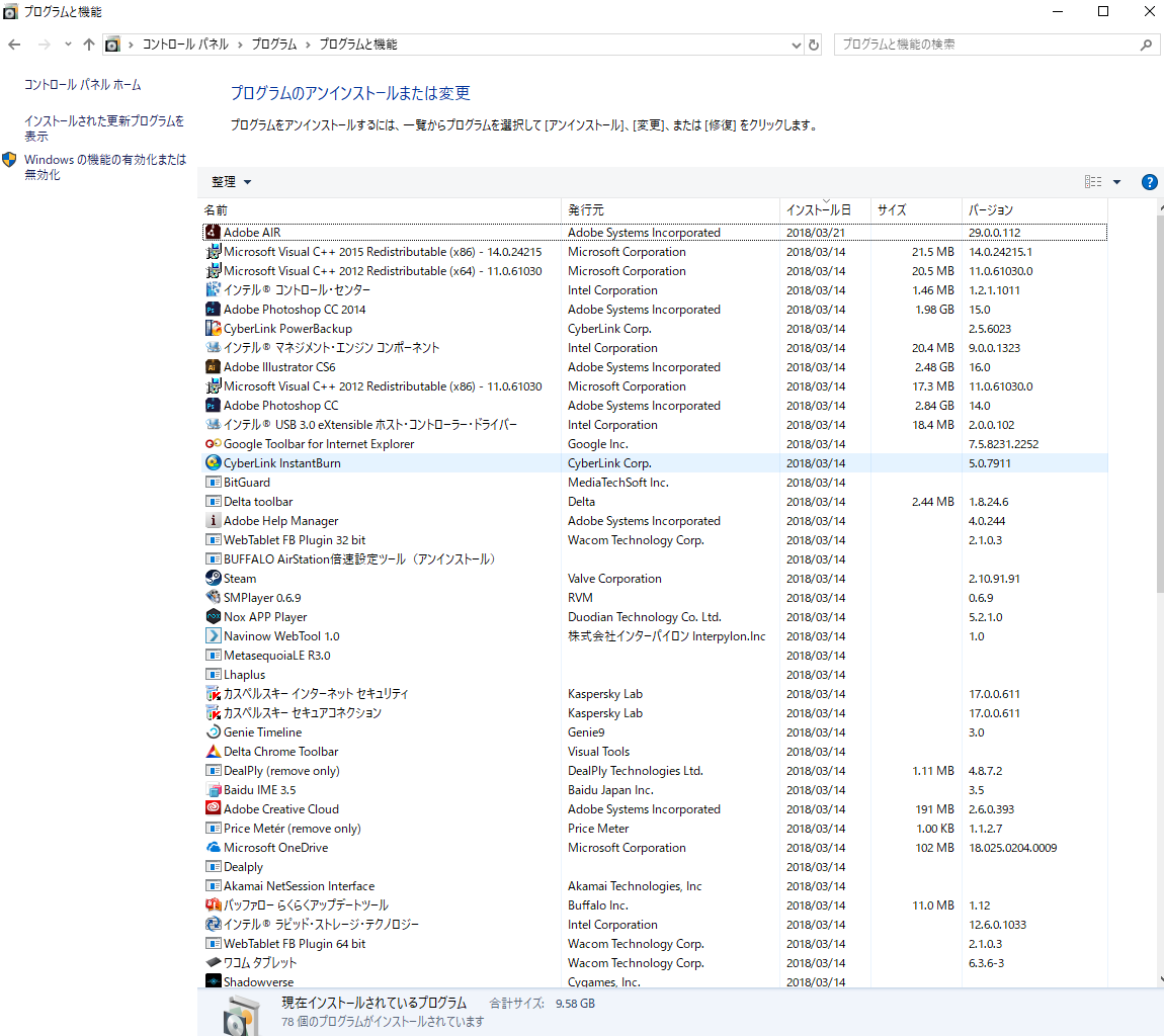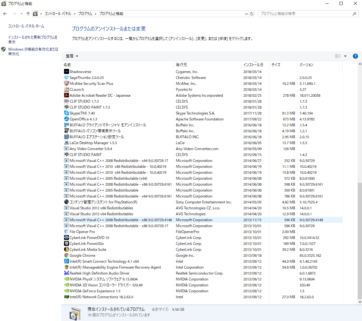 *[コントロールパネル]→[プログラムと機能]を選択いただき、表示される一覧