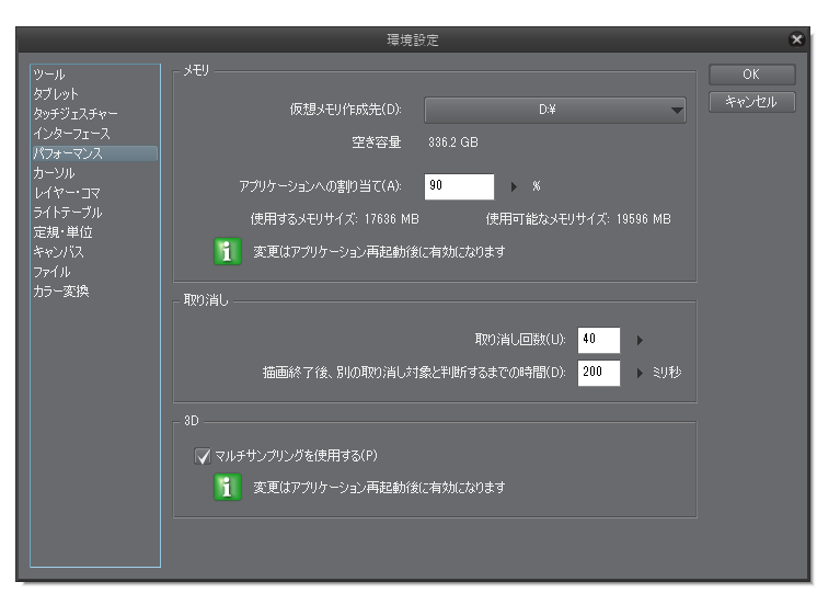 *[ファイル]メニュー→[環境設定]→[パフォーマンス]を選択いただき、表示