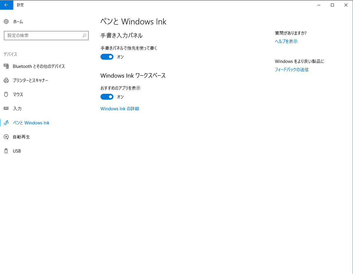 左側で[ペンとWindows Ink]の順に選択すると表示されるページのすべての