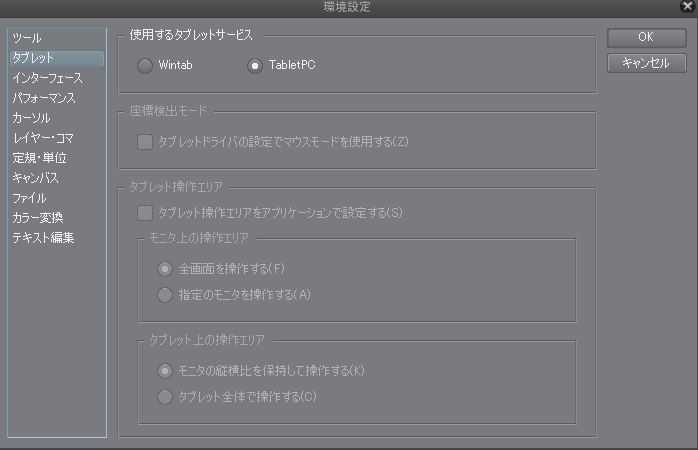 ・[ファイル]メニュー→[環境設定]を開き、左側の[タブレット]カテゴリを選択した状態で、