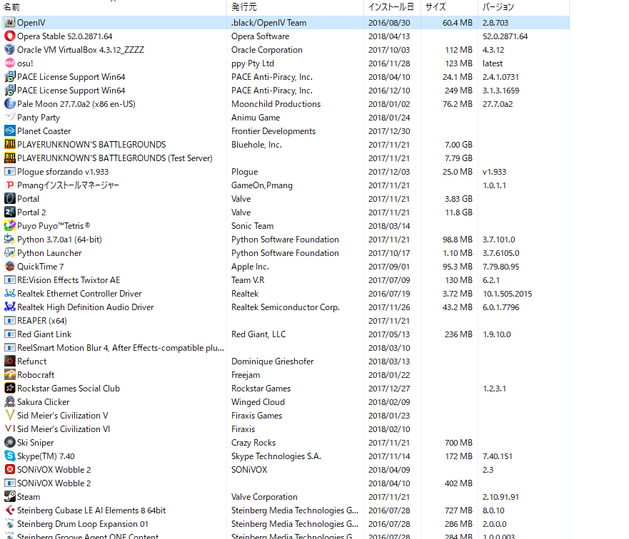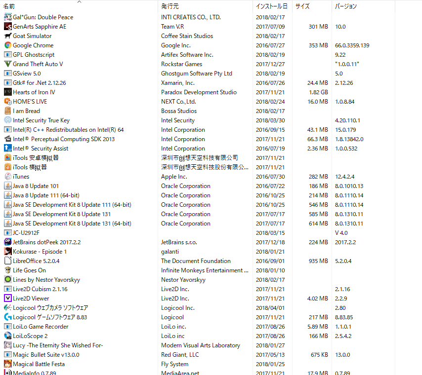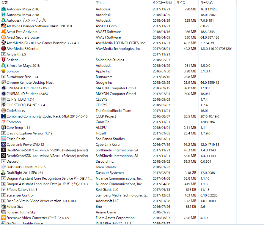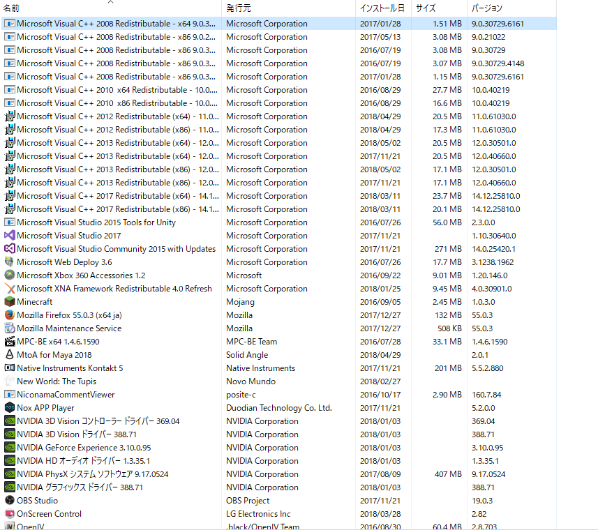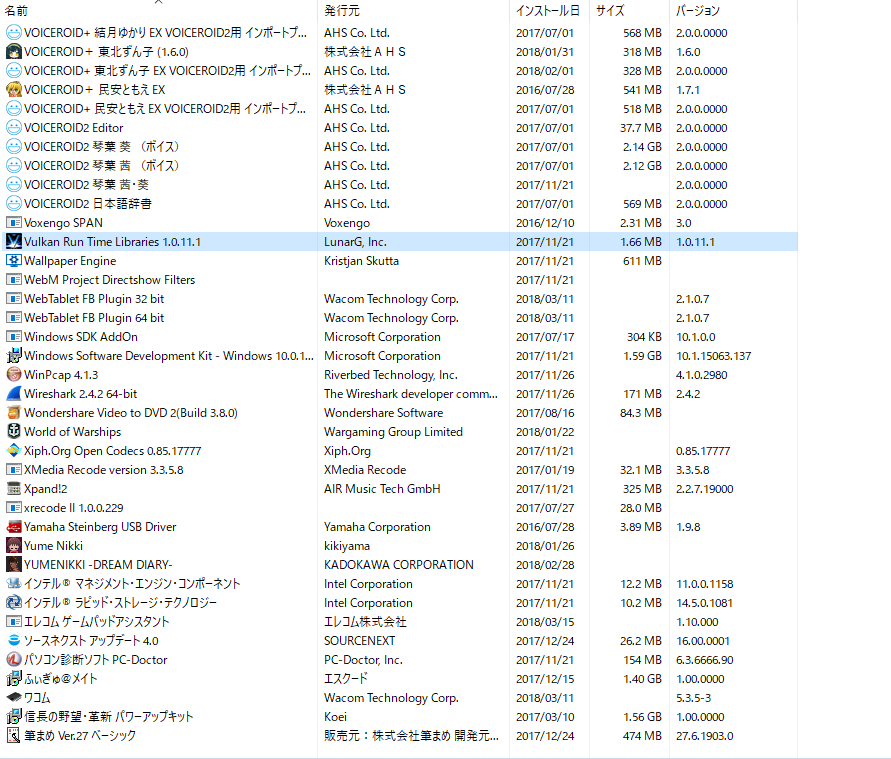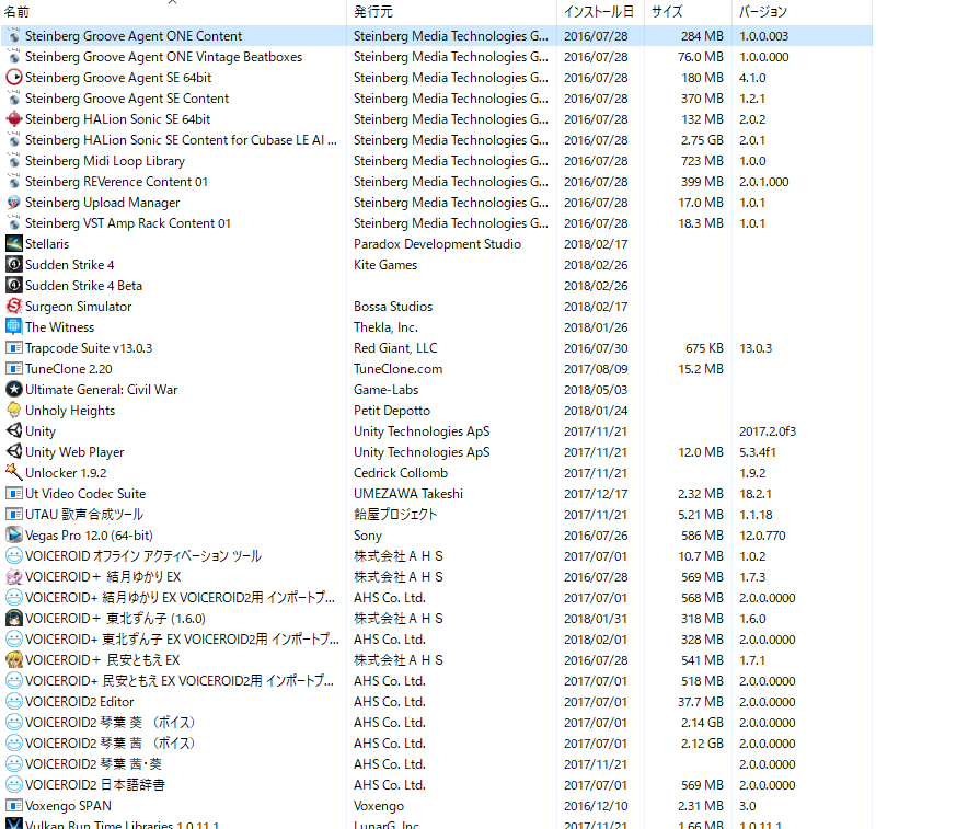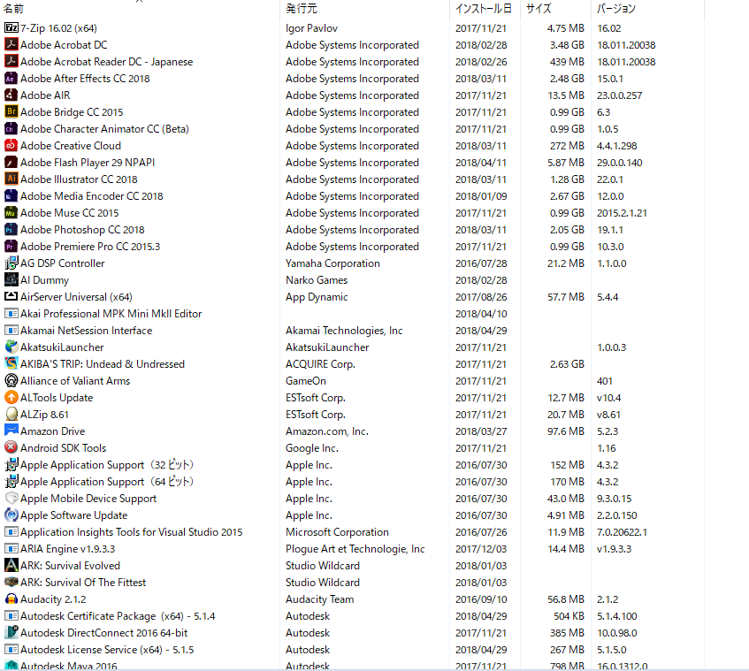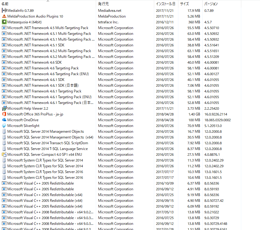 (プログラムと機能)]を選択して表示される画面のすべての項目が