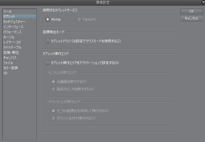 表示される画面左側で[タブレット]を選択した状態の画面のスクリーンショット