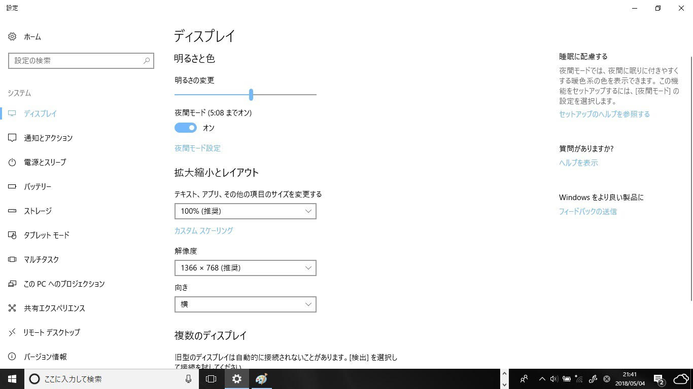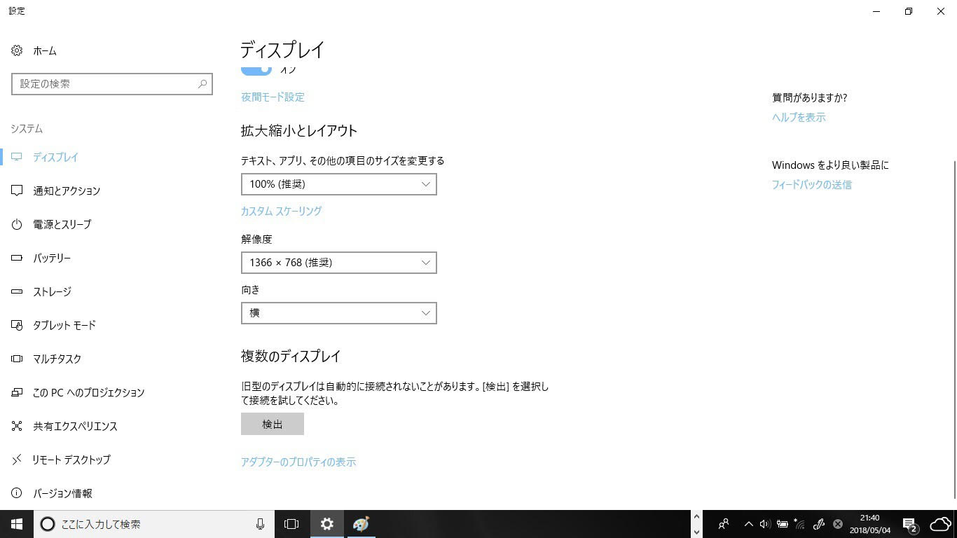 ・[Windowsスタート]→[設定]→[システム]を選択し、表示される画面の