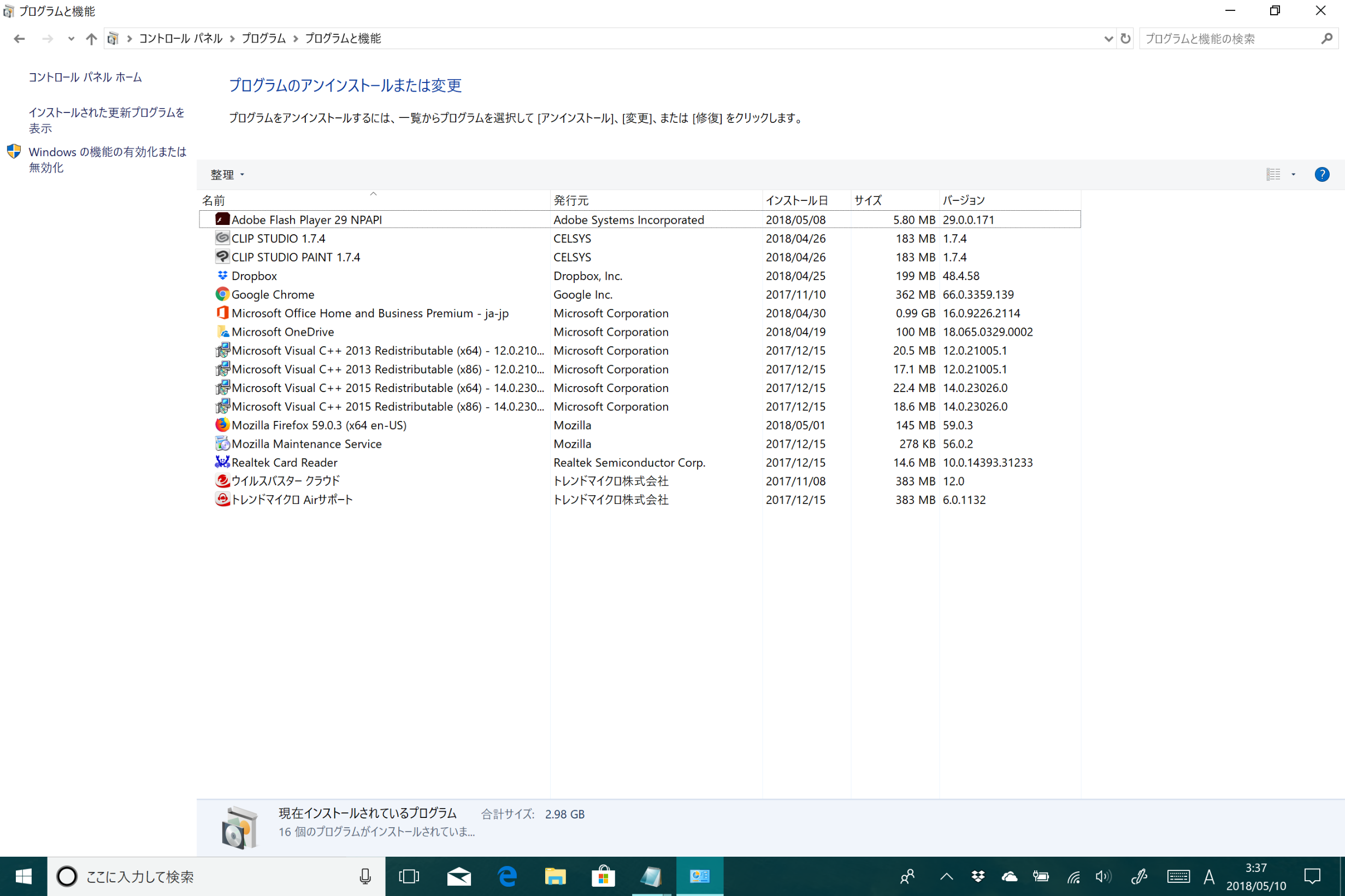 (プログラムと機能)]を選択して表示される画面のすべての項目が
