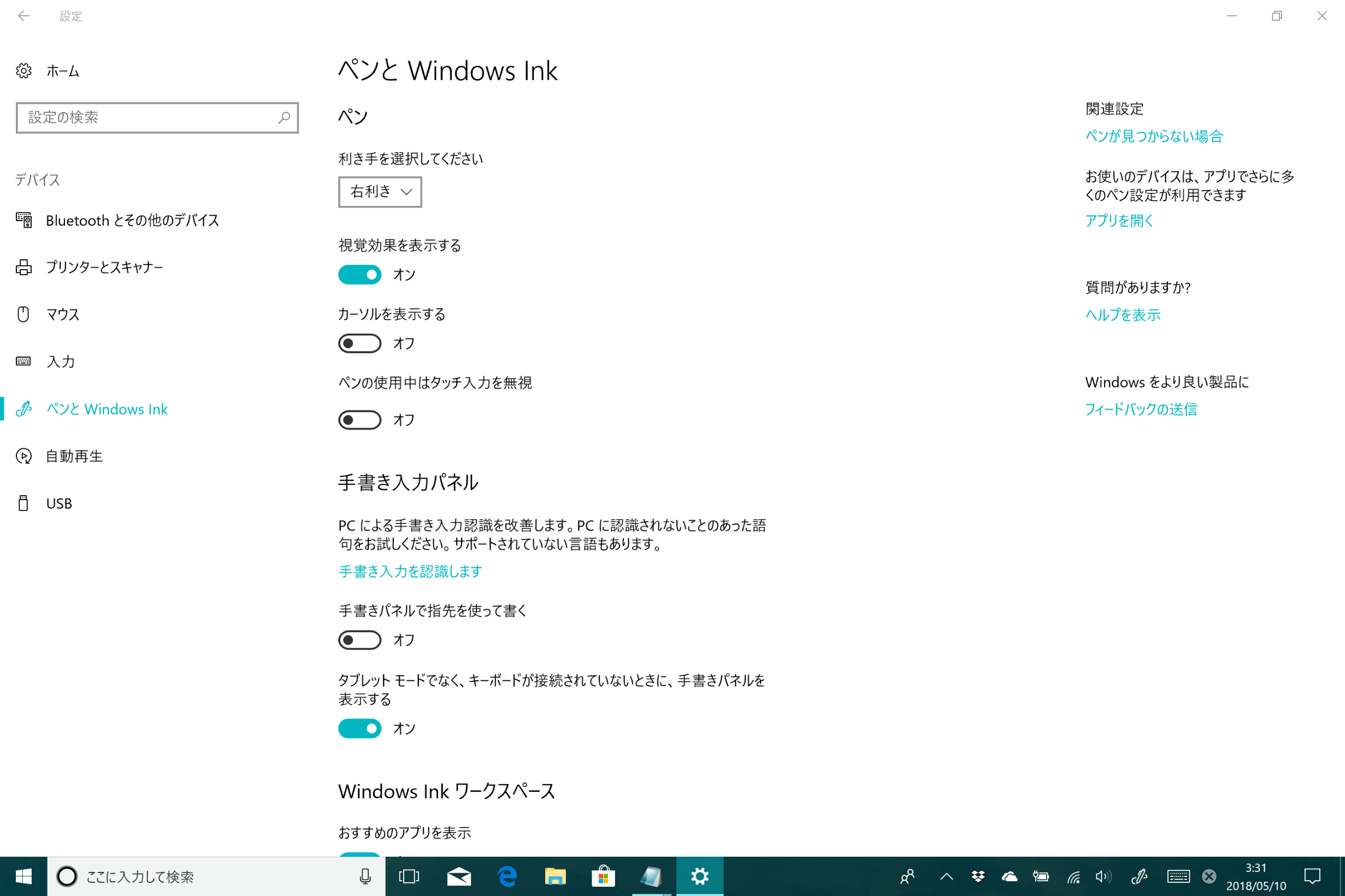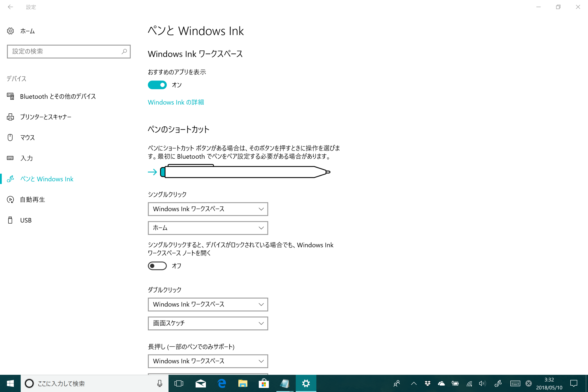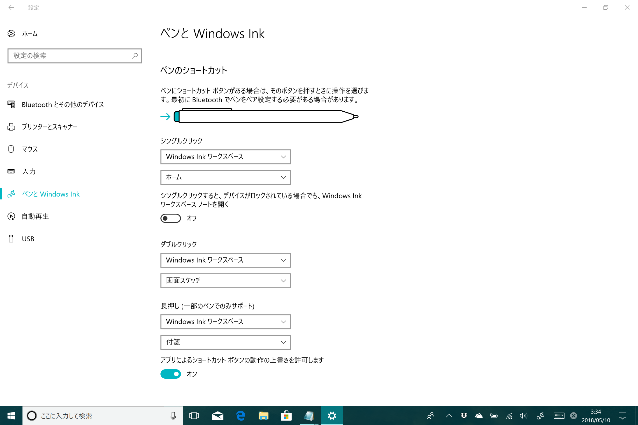 左側で[ペンとWindows Ink]の順に選択すると表示されるページのすべての