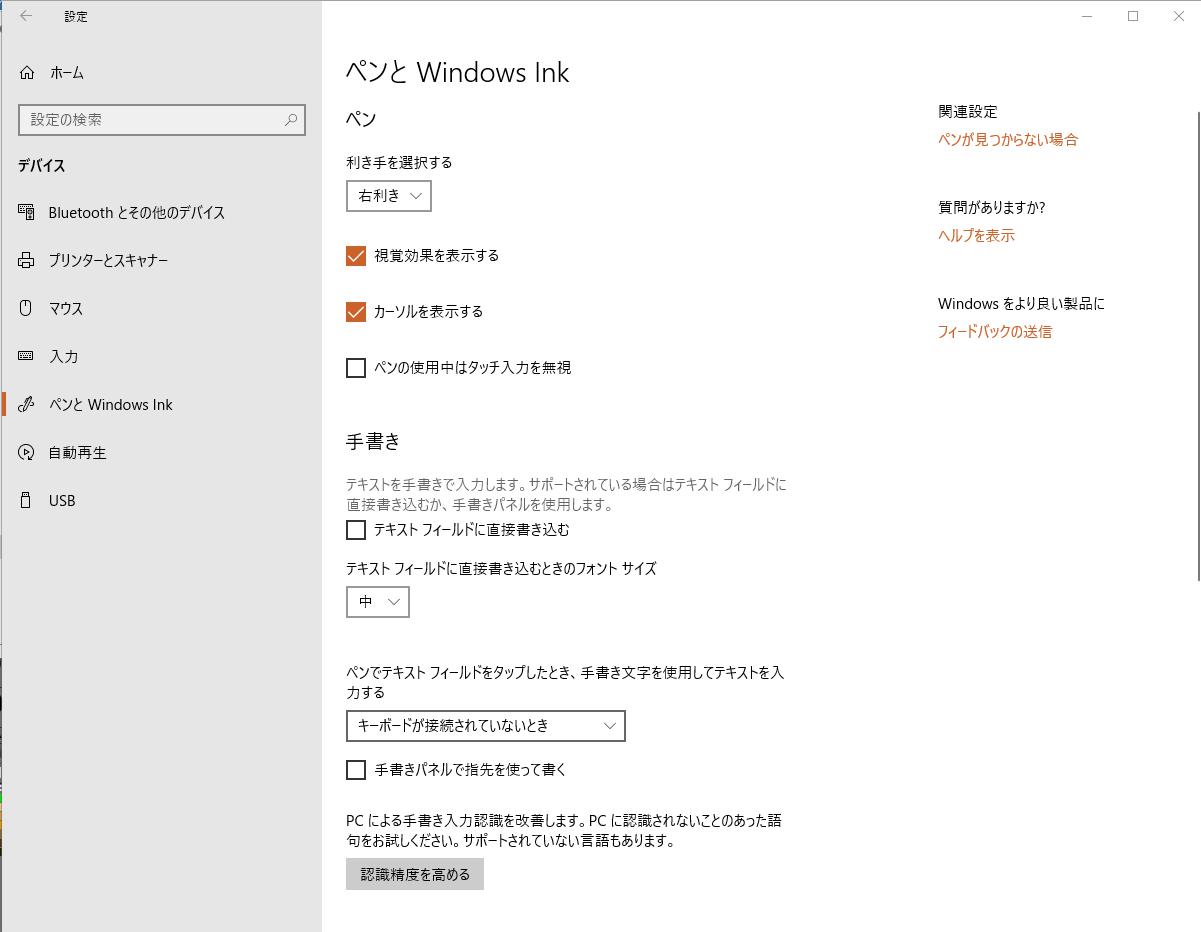 左側で[ペンとWindows Ink]の順に選択すると表示されるページのすべての