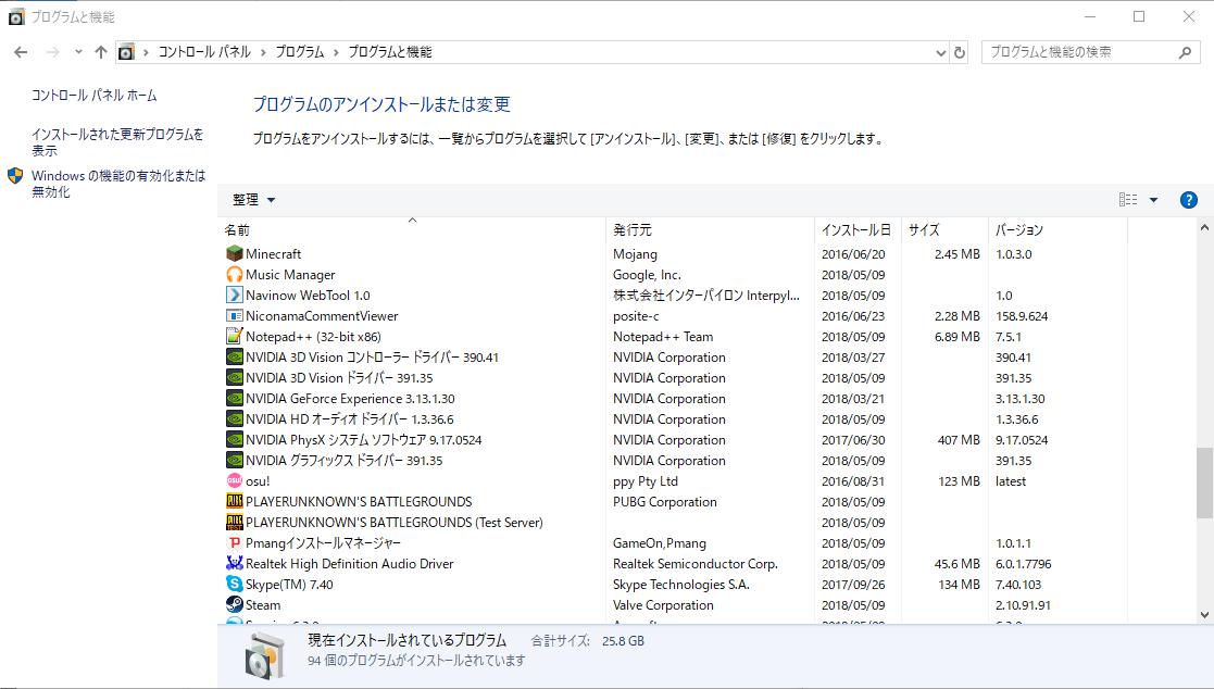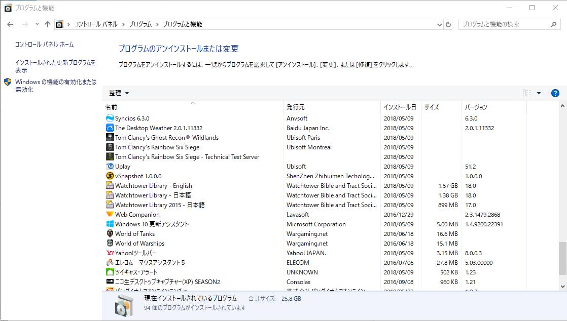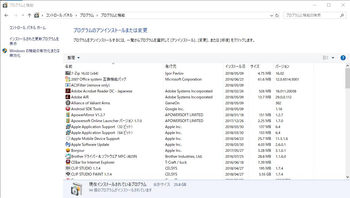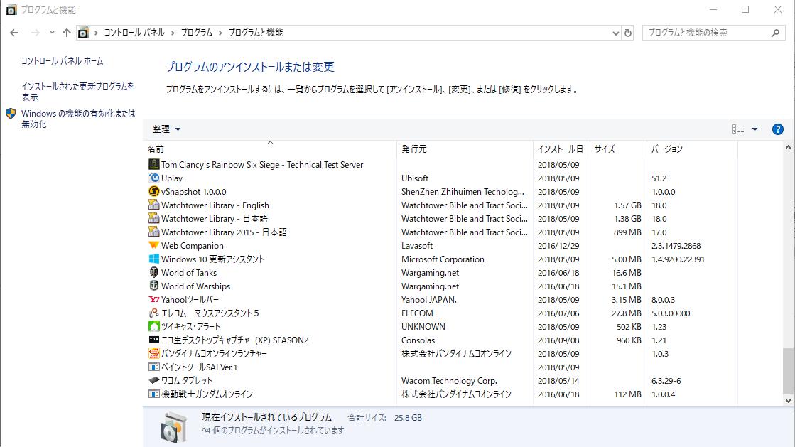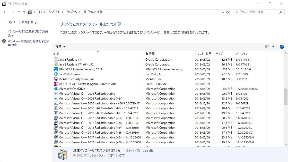 (プログラムと機能)]を選択して表示される画面のすべての項目が
