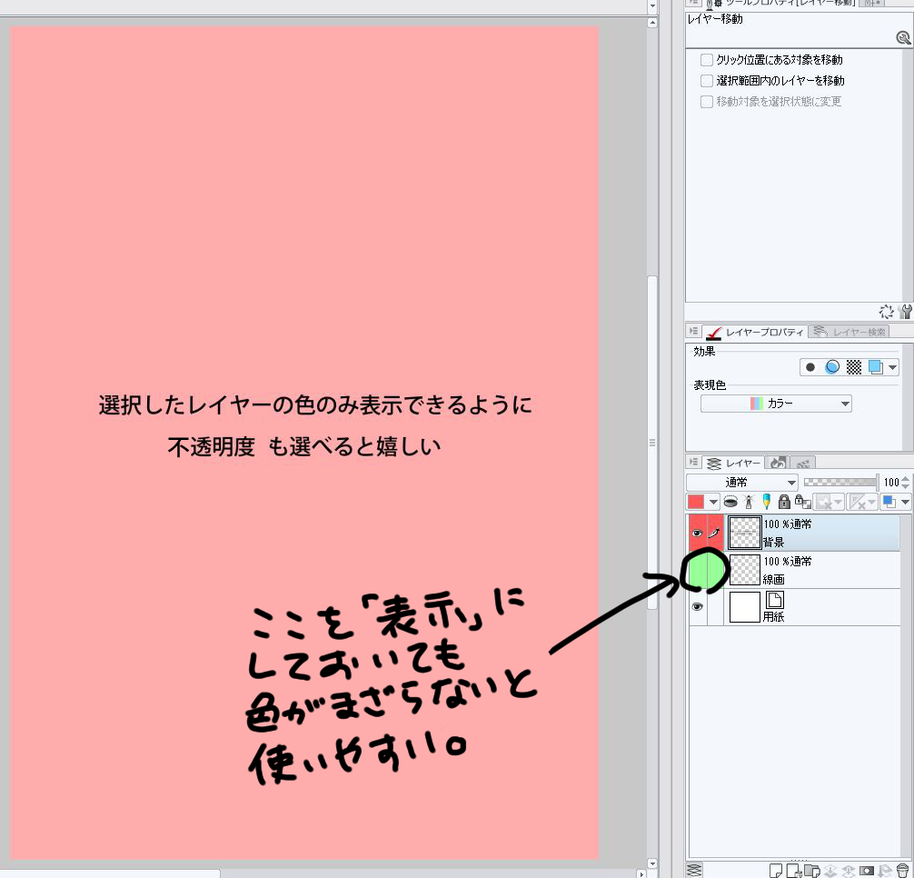 お世話になっております。 書き込みが初めてなのでカテ違いだったら申し訳ありません。 タイトル通りの要望なのですが 「パレットカラーをキャンバスにも表示」で乗算ではなく 不透明も選択できるようにして頂けると嬉しいです。 他の質問でアニメ制作現場での利用を目的とした機能とあったのですが 不透明が選択できればモノクロ原稿を作成するときにも 便利だと思いました。 ![]() ![]() ![]() 画像の通りなのですが、伝わりますでしょうか。 モノクロ原稿で別レイヤーに間違えて描き込むのを避けるのに使いたいです。 レイヤーカラーを使うと書き込んだ色が変わるのでそちらを使えばという意見もあるかと思うのですが 個人的には下描きには便利なのですが 線画には少し不便です(印刷用に保存するとき黒に戻さないといけないので) あと、選ぶ色によっては目の疲れの軽減にもなりそうかなと。 現状はグレーで塗りつぶしたレイヤーを一番下にして他のレイヤーを乗算で描き込んでいます。 ご検討頂けますと幸いです。 よろしくおねがいします。 ------------------------------------------------------------ ■バージョン: ※Windowsは、[ヘルプ]メニュー → [バージョン情報]で確認できます。 ※MacOSXは、[CLIP STUDIO PAINT]メニュー → [バージョン情報]で確認できます。 ※iPadは、[CLIP STUDIO PAINT]アイコン → [バージョン情報]で確認できます。 ■グレード DEBUT( ) PRO( ) EX( ) ■OS Windows XP( ) Windows Vista( ) Windows 7 ( ) Windows 8( ) Windows 8.1( ) Windows 10( ) MacOS X 10.5( ) MacOS X 10.6( ) MacOS X 10.7( ) MacOS X 10.8( ) MacOS X 10.9( ) MacOS X 10.10( ) MacOS X 10.11( ) mac OS 10.12( ) mac OS 10.13( ) iOS 11( ) その他( ) ------------------------------------------------------------ |
