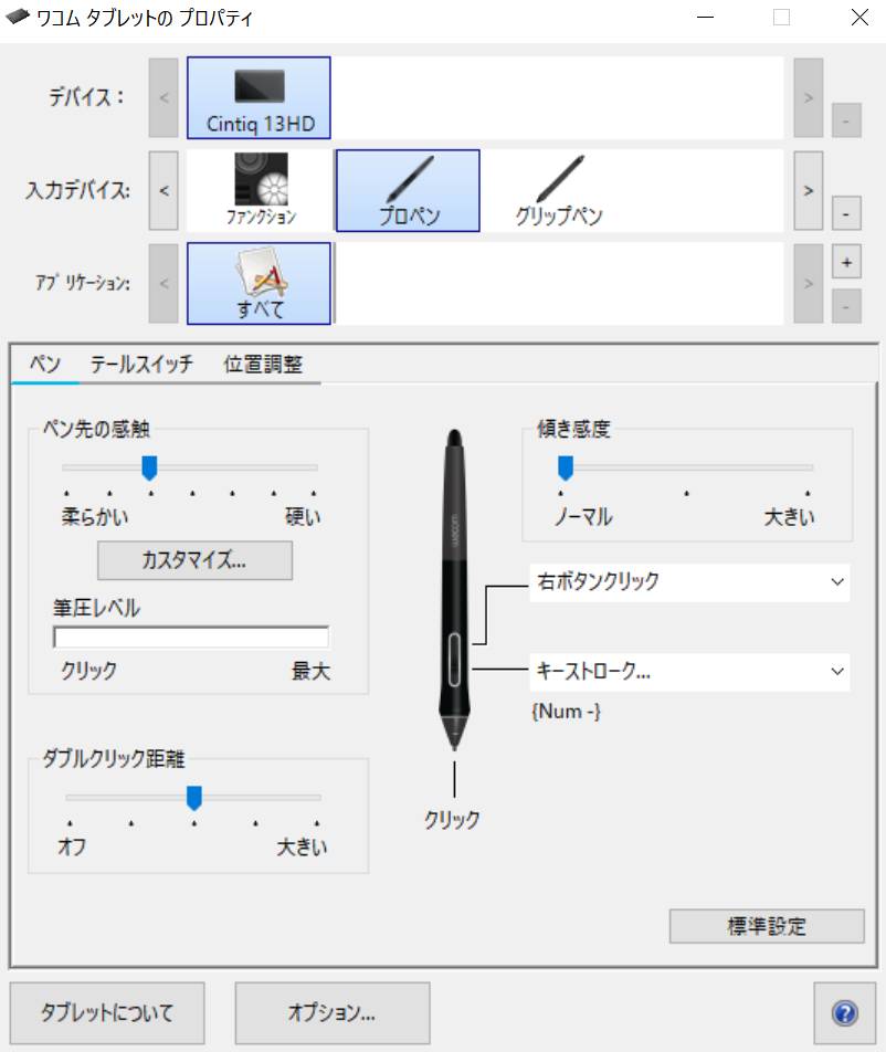 ・[コントロールパネル]→[ワコムタブレットのプロパティ]を選択し、