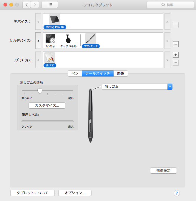 ・[アップル]メニュー>[システム環境設定]>[ワコムタブレット]を開き、