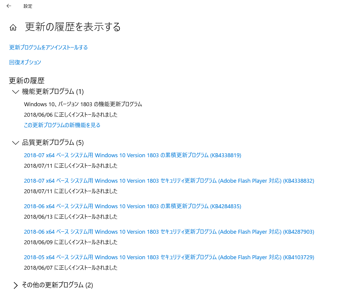 ・[Windowsスタート]→[設定]→[更新とセキュリティ]を選択し、[更新の履歴]を