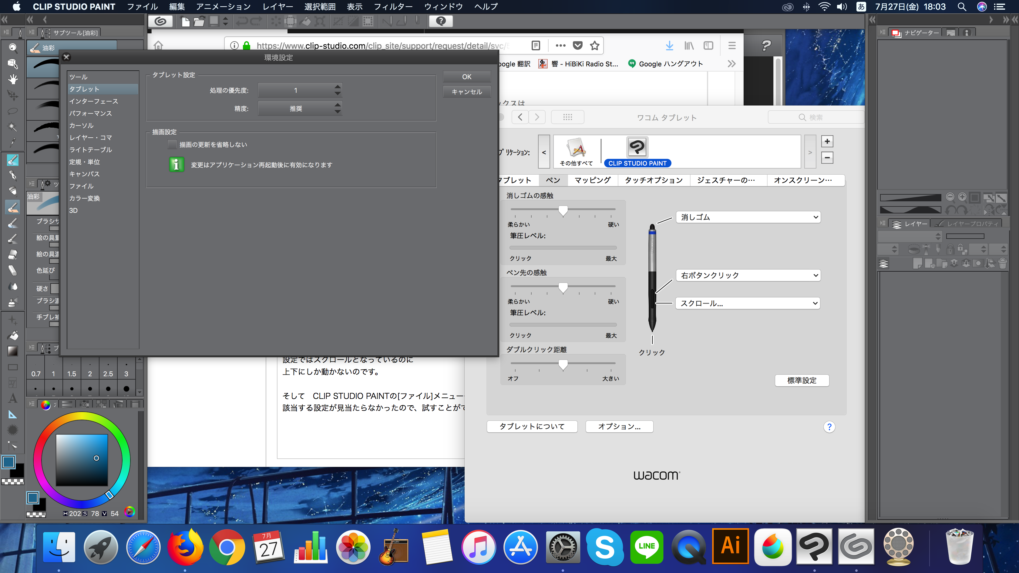 数ヶ月ほど前から、線を引くごとにツールが変わるという謎のバグが発生し始めました。 当初はパソコンの再起動や、キーボード、ペンタブの接続を切ってまた繋げると 元に戻っていましたので、さして気にしてはいなかったのですが、 一ヶ月ほど前から再起動などしても治らなくなり、まともにお絵描きするのが難しくなりました。 そこで一度質問をしようと、状態を伝えるためにスクショしましたところ、 一時的にではありますが治ってしまいまして質問は保留にしていたのですが、 しばらくしてまた再発しまして、これはさすがにおかしいと思い クリスタのアンインストールをして、インストールし直しましたが やはり治らず、ショートカットキーを初期化しましたところ直りましたので そのまま3日ほど使っていたのですが、クリスタのアップデートが来ましたので、 アプデしましたところ、再発してしまいました。 また、再発するたびに状況が悪化している気がしてなりません。 バグの作動条件の詳細です。 ペンツールを選びキャンバスに線を引くと、引き終わったところで鉛筆ツールに自動で変わってしまう。 (変わるツールは鉛筆ツール固定のよう) たまに変なところで変わったりもしますが、基本はペンの装飾キーを押してキャンバスを移動させたあとに 線を引くと変わってました。 最初はペンツールだけだったのに、悪化していくにつれて消しゴムツールなどにも影響が出て来ました。 他の場所で質問させていただきましたところ、 「タブレットドライバー のアンインストール」を試すことになり 試したところ、線を引いた後に手のひらツールになる、 ペンツールの装飾キーが設定ではスクロールになっているのに上下の移動しかできない という状況になってしまいました。 まともにお絵描きができず、とても危機感を募らせています! 拙い文章ではありますが、ご回答お願いいたします。 (誤字脱字すいません...) ------------------------------------------------------------ ■バージョン: ※Windows/MacOSXは、右上の[?]アイコンをクリック後に[バージョン情報]で確認できます。 ※iPadは、PAINTの[CLIP STUDIO PAINT]アイコンをクリック後に[バージョン情報]で確認できます。 ■OS Windows XP( ) Windows Vista( ) Windows 7 ( ) Windows 8( ) Windows 8.1( ) Windows 10( ) MacOS X 10.5( ) MacOS X 10.6( ) MacOS X 10.7( ) MacOS X 10.8( ) MacOS X 10.9( ) MacOS X 10.10( ) MacOS X 10.11( ) mac OS 10.12( ) mac OS 10.13( ○ ) iOS 11( ) その他( ) ------------------------------------------------------------ |