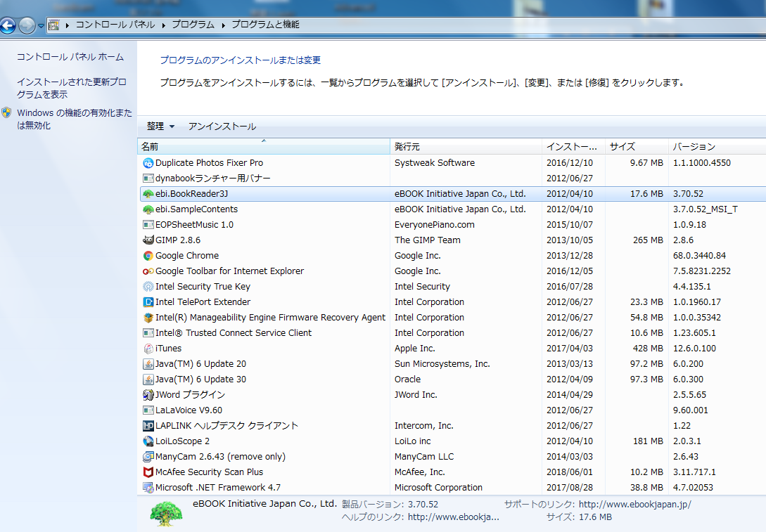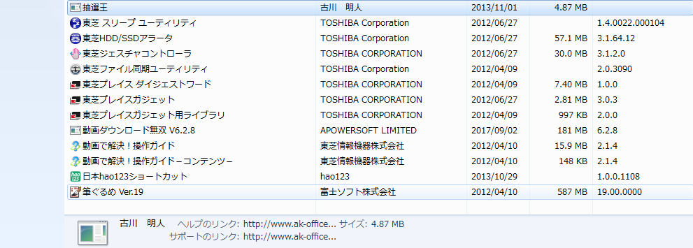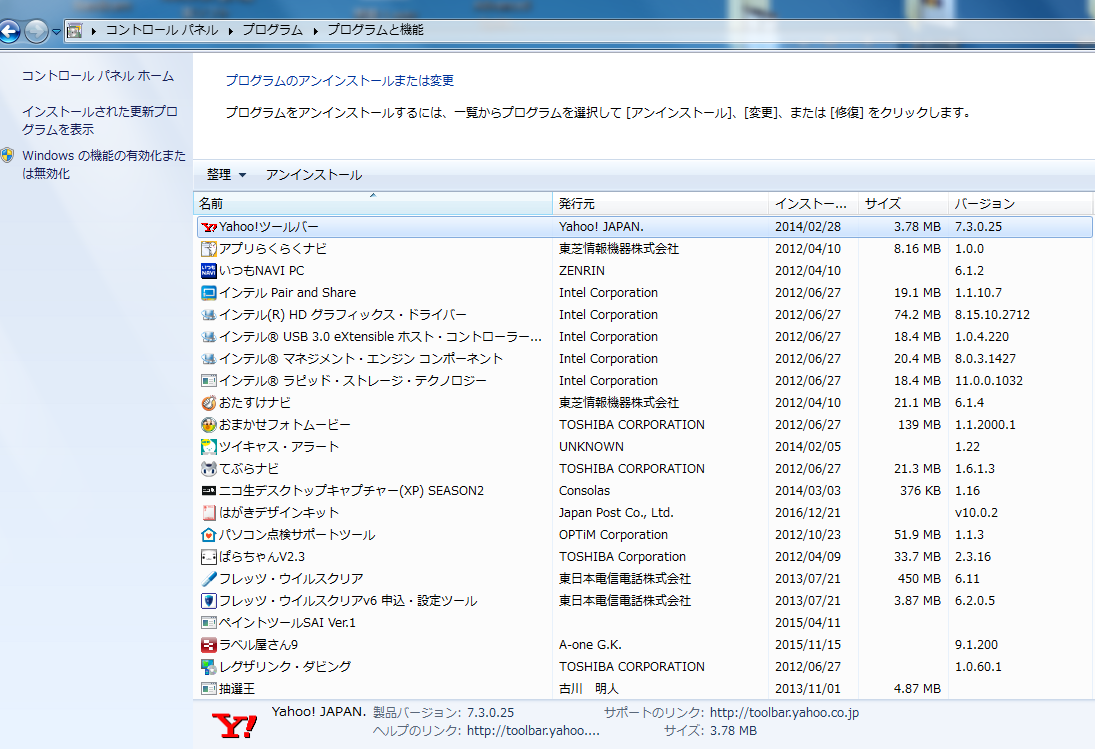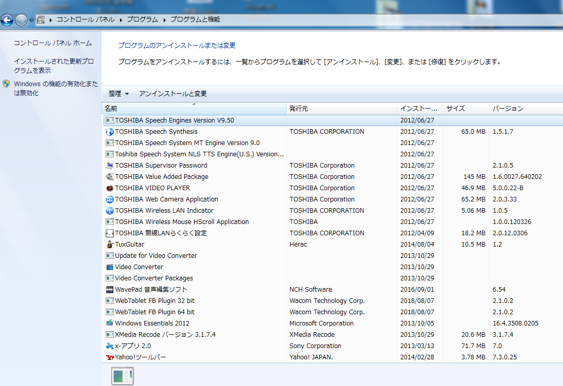 ご返答ありがとうございます。パソコンのメーカーはTOSHIBA、型番はdynabook REGZA PC D712/T3FWです。プログラム、環境設定の写真を添付いたしました。よろしくお願いします。