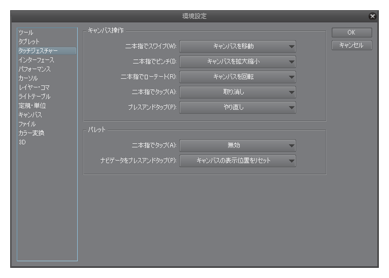 CLIP STUDIO PAINTの[ファイル]メニュー→[環境設定]の[タブレット]の
