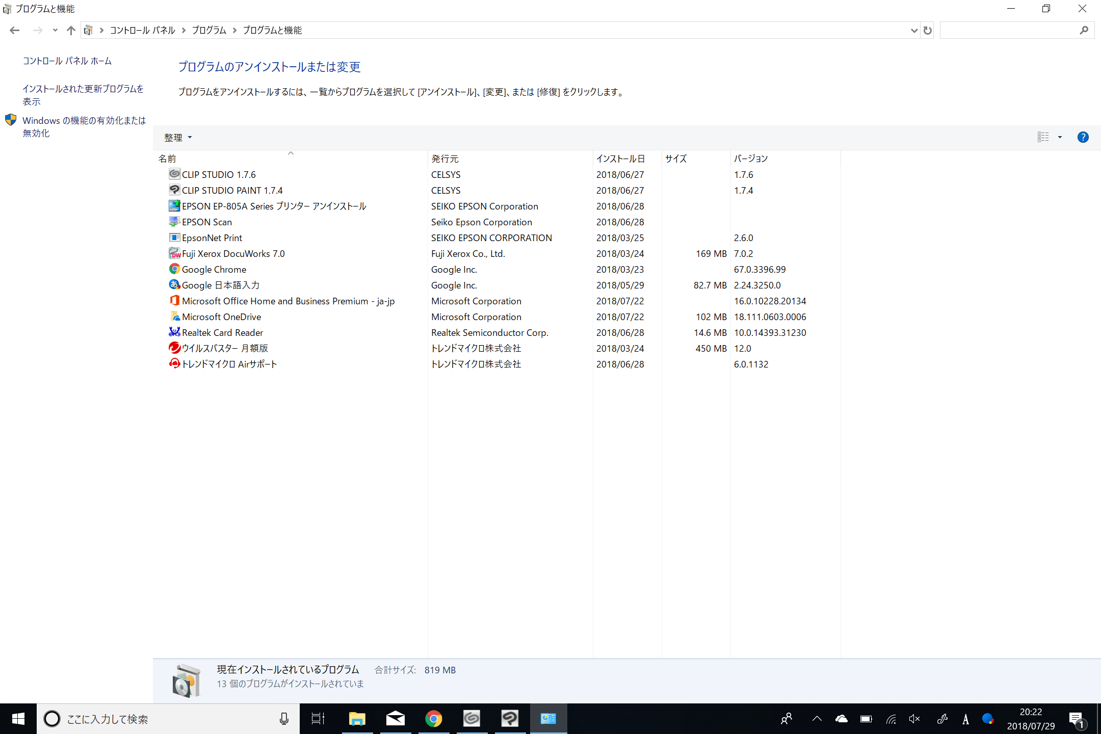 (プログラムと機能)]を選択して表示される画面のすべての項目が