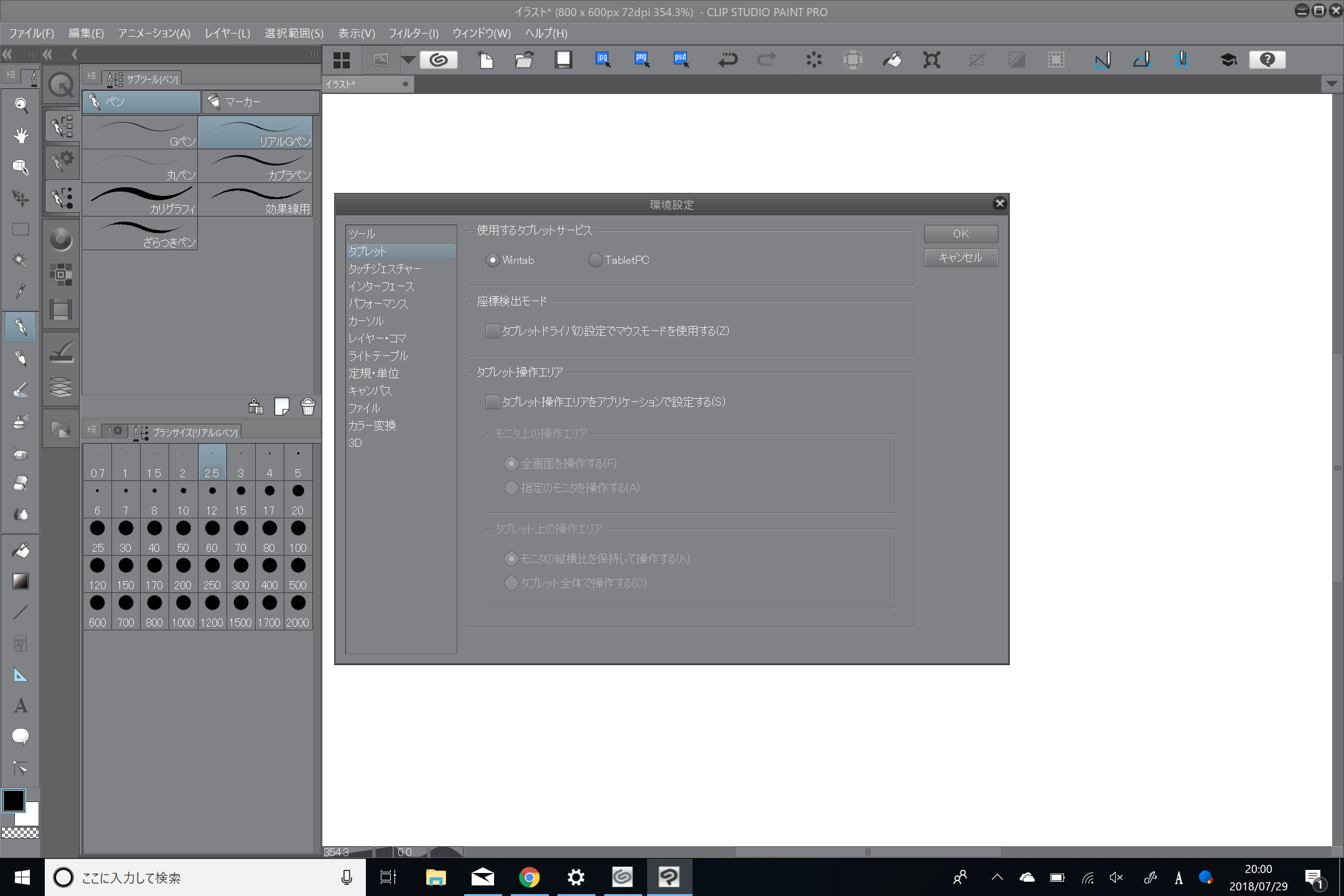 表示される画面左側で[タブレット]を選択した状態の画面のスクリーンショット
