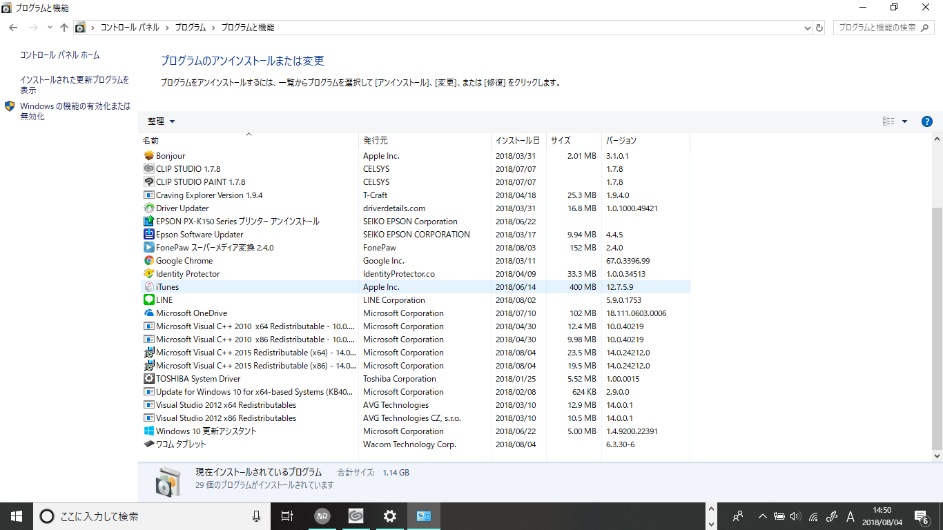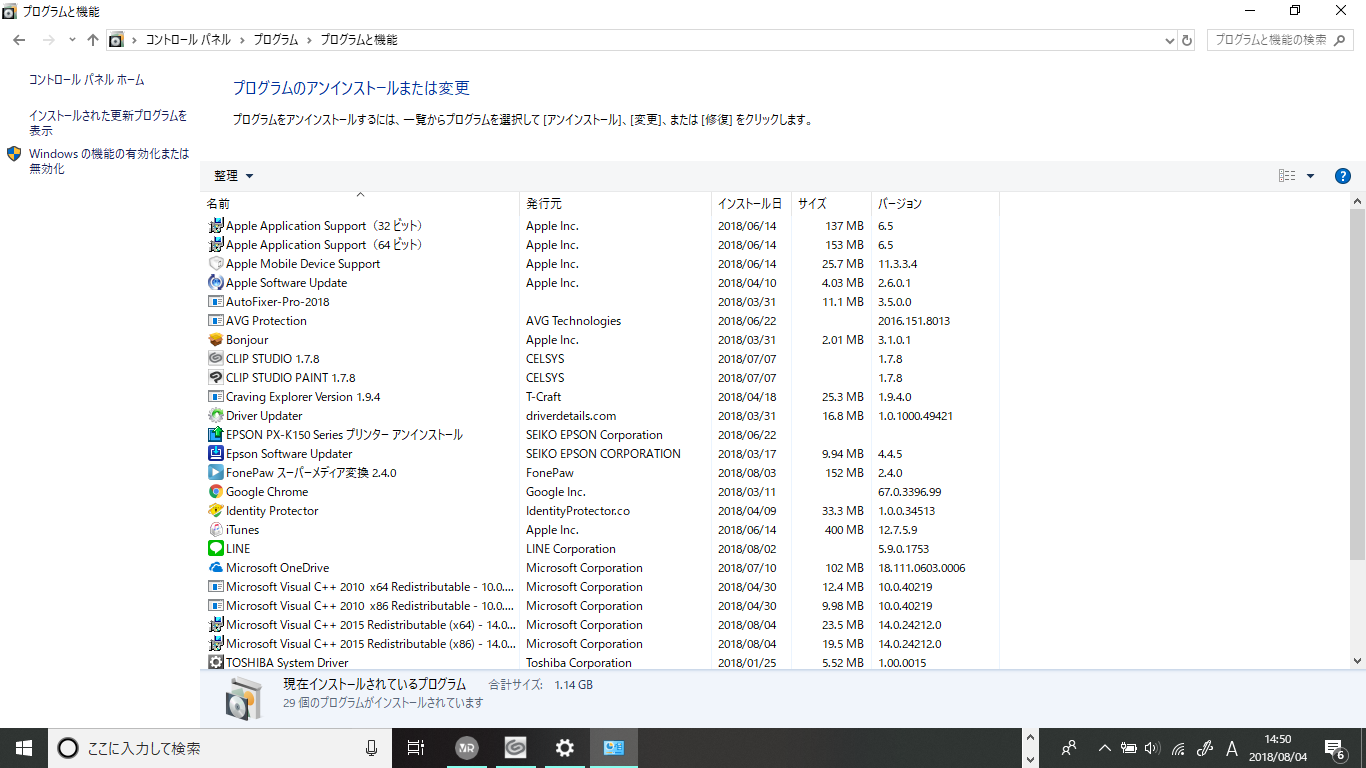 (プログラムと機能)]を選択して表示される画面のすべての項目が