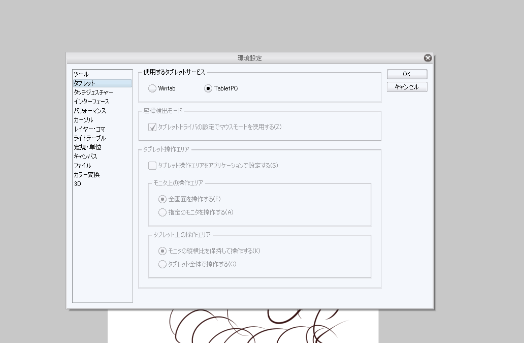 表示される画面左側で[タブレット]を選択した状態の画面のスクリーンショット