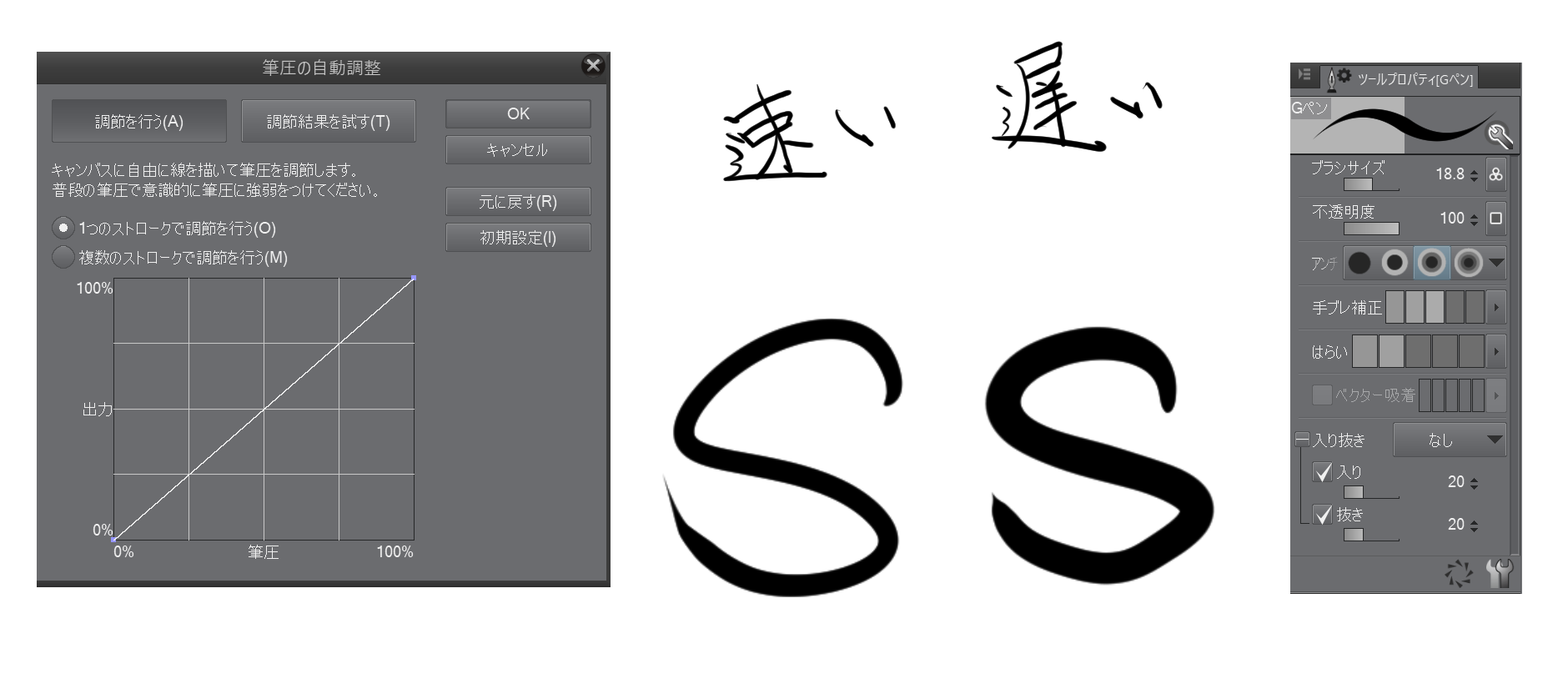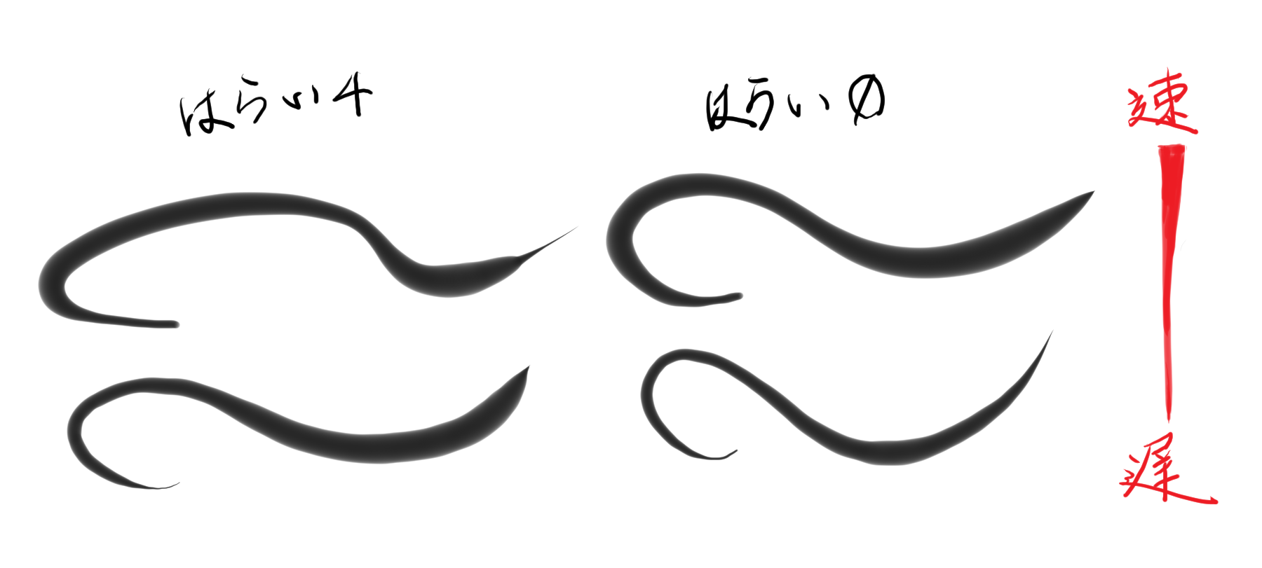 上記の画像の通りですが、クリスタで曲線などを描画する際には勝手に入りとしっぽのようなハネが出ます。 ペンの設定は入り抜き両方無しで、手ぶれ補正もなしです。 はらいはありですが、はらいの数値が高ければ高いほど、線の抜き?しっぽが長くなります。
