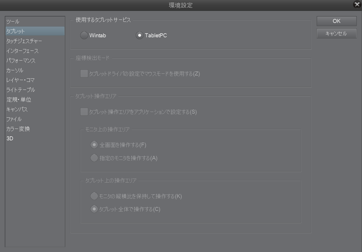 [タブレット]を選択後、[使用するタブレットサービス]を[Wintab]、