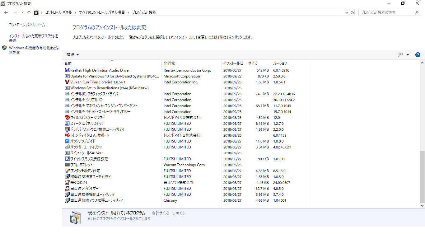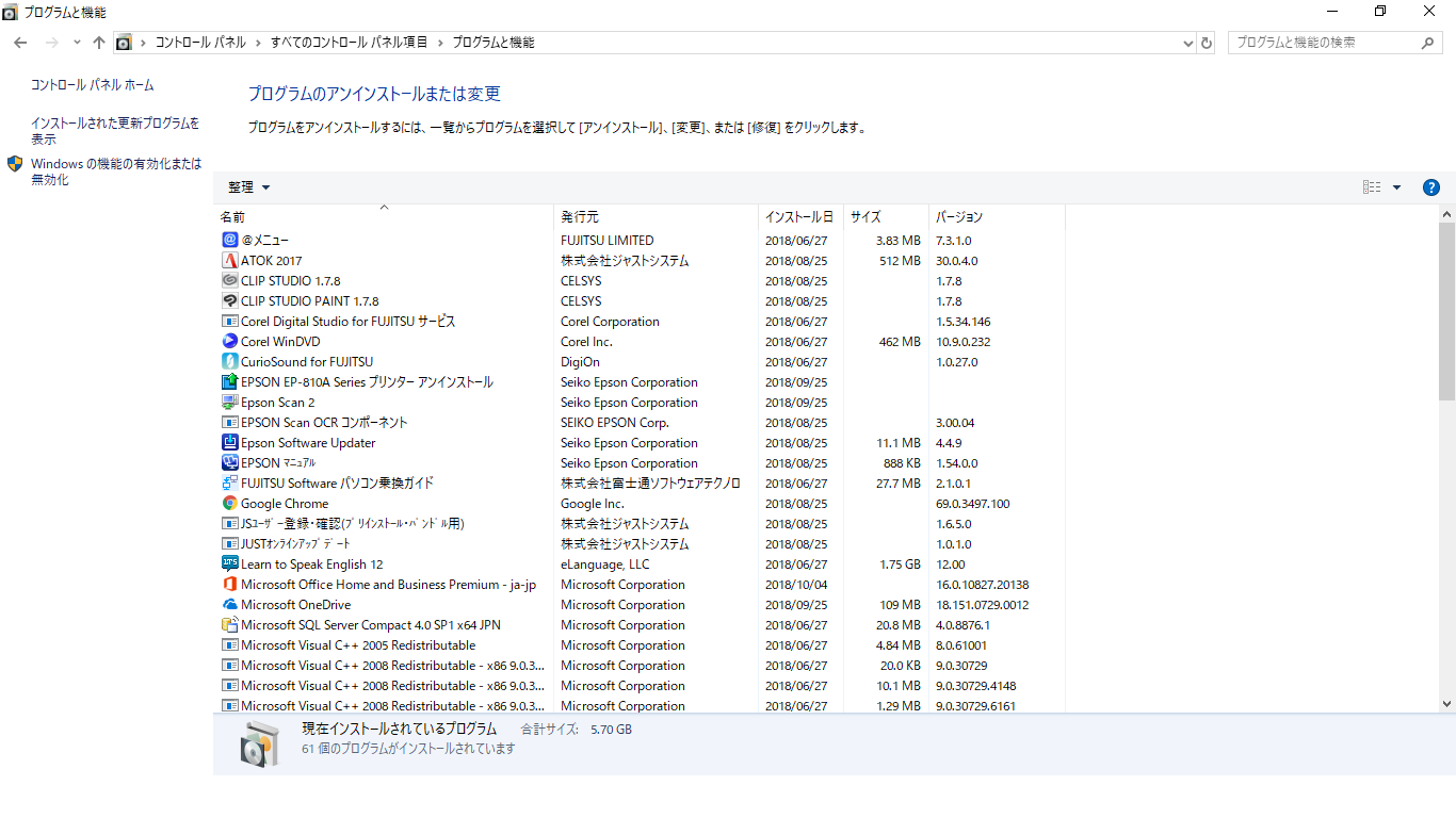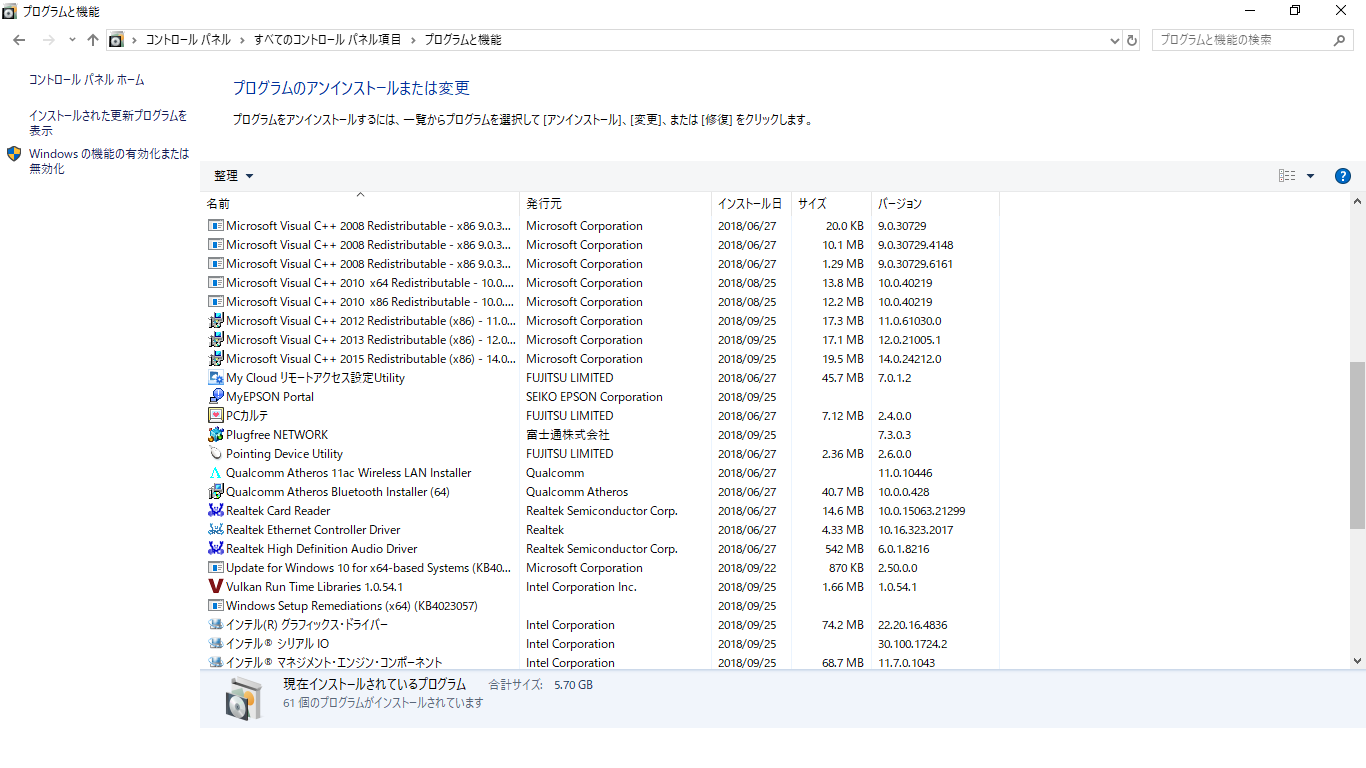 (プログラムと機能)]を選択して表示される画面のすべての項目が