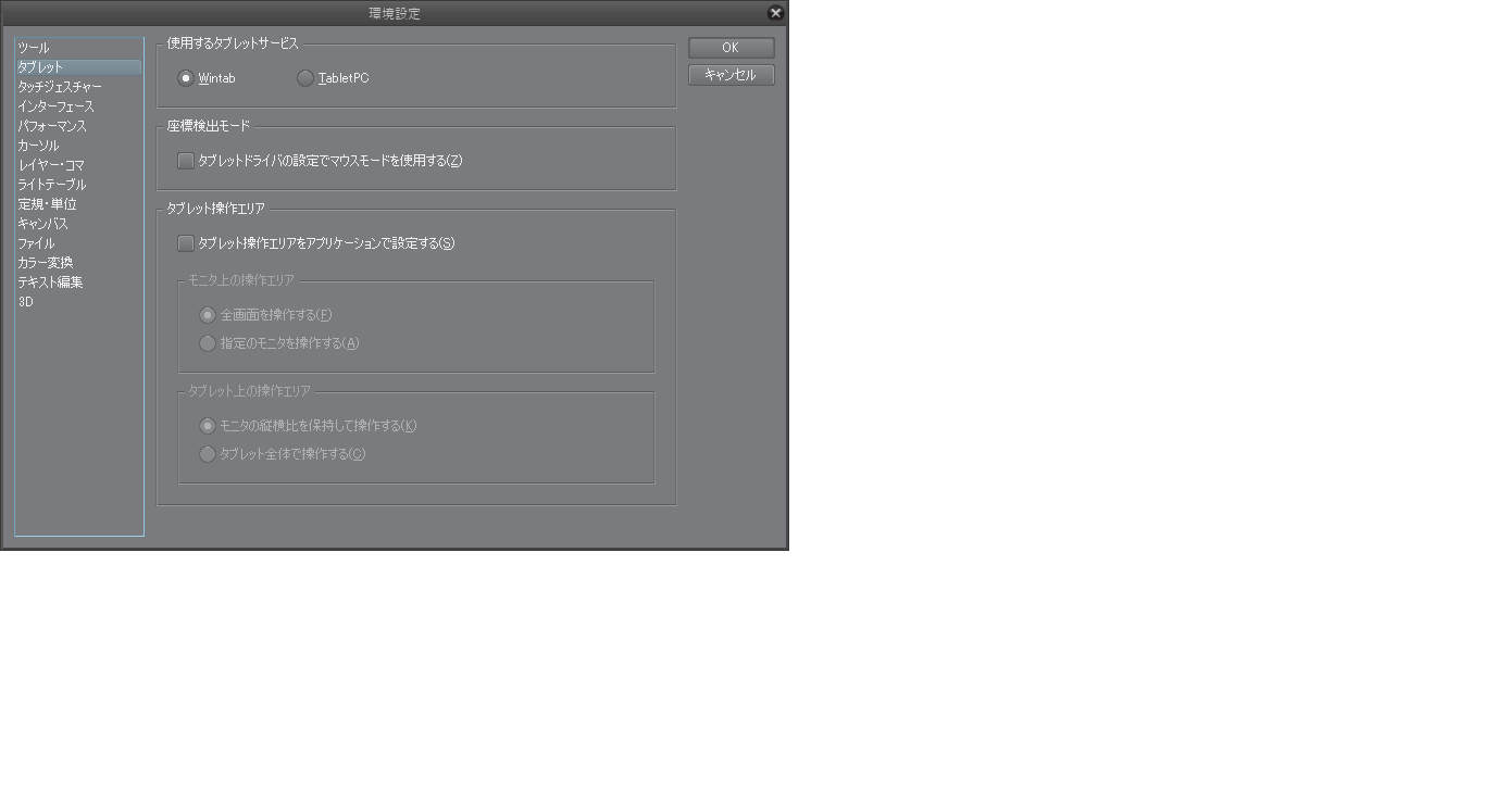 表示される画面左側で[タブレット]を選択した状態の画面のスクリーンショット