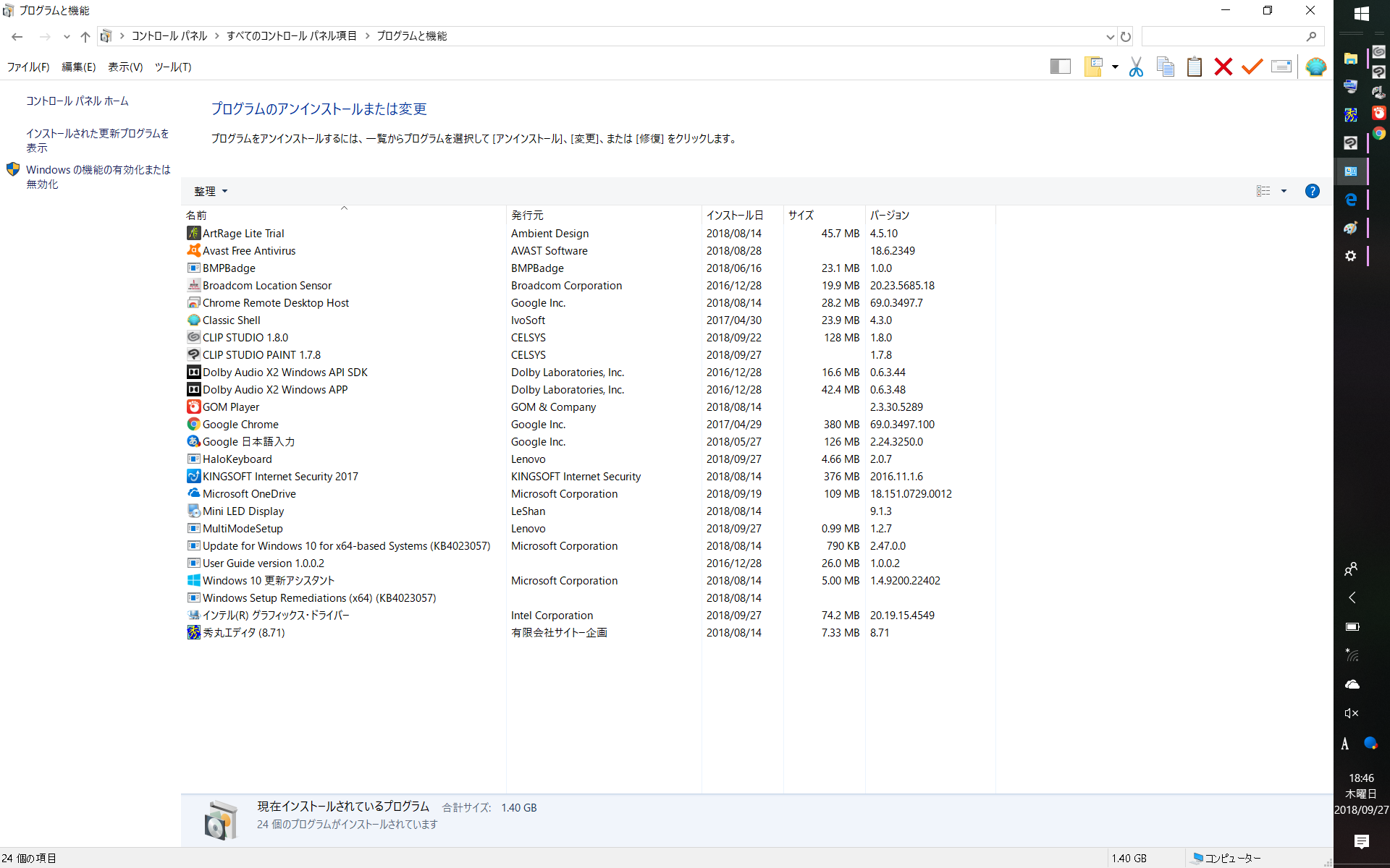 (プログラムと機能)]を選択して表示される画面のすべての項目が