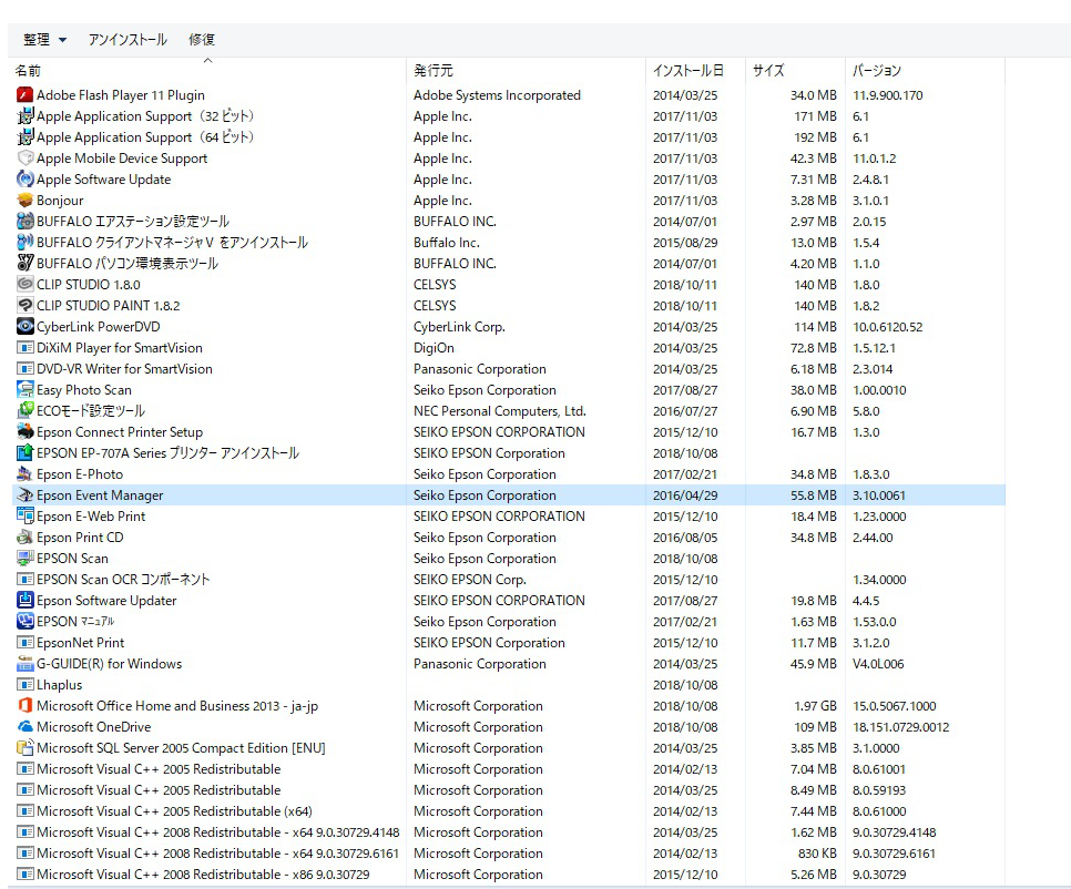 (プログラムと機能)]を選択して表示される画面のすべての項目が