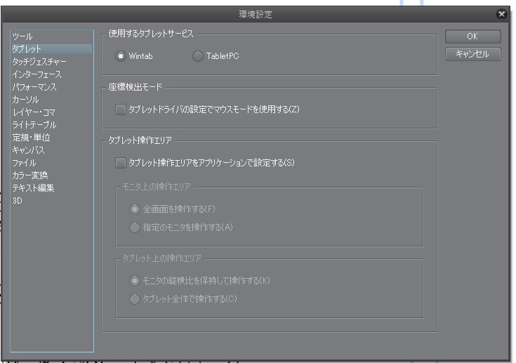表示される画面左側で[タブレット]を選択した状態の画面のスクリーンショット