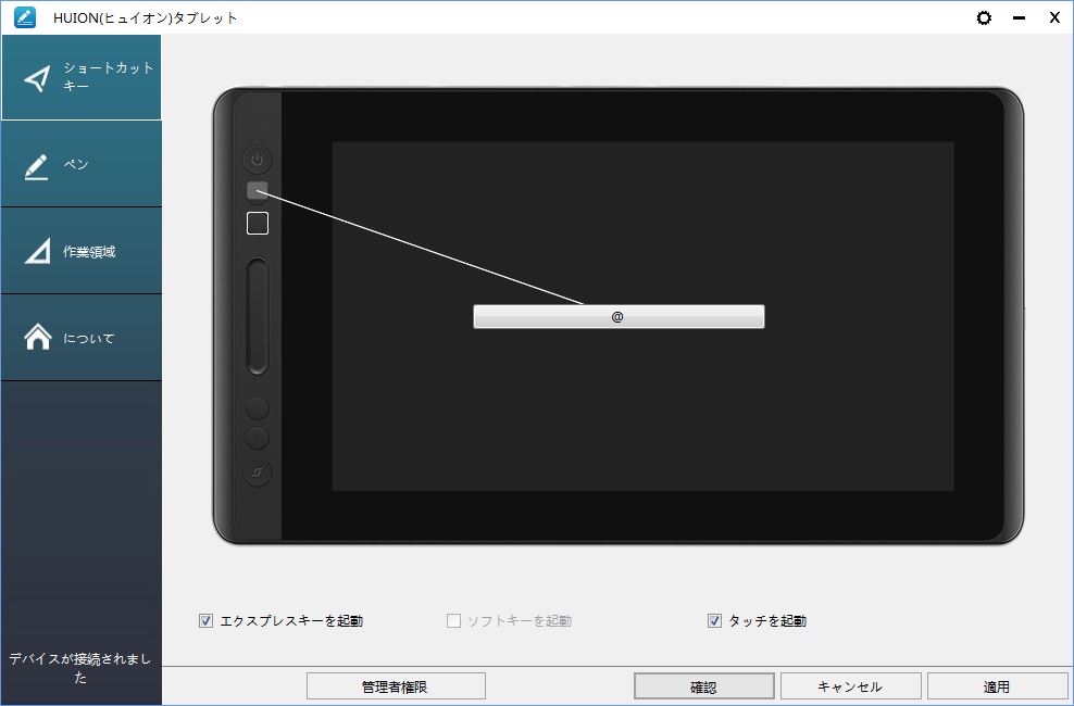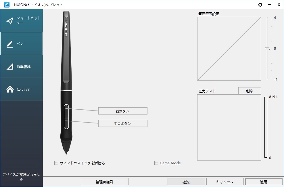 画面を表示し、ペンの設定とタブレット本体のサイドボタンの設定内容