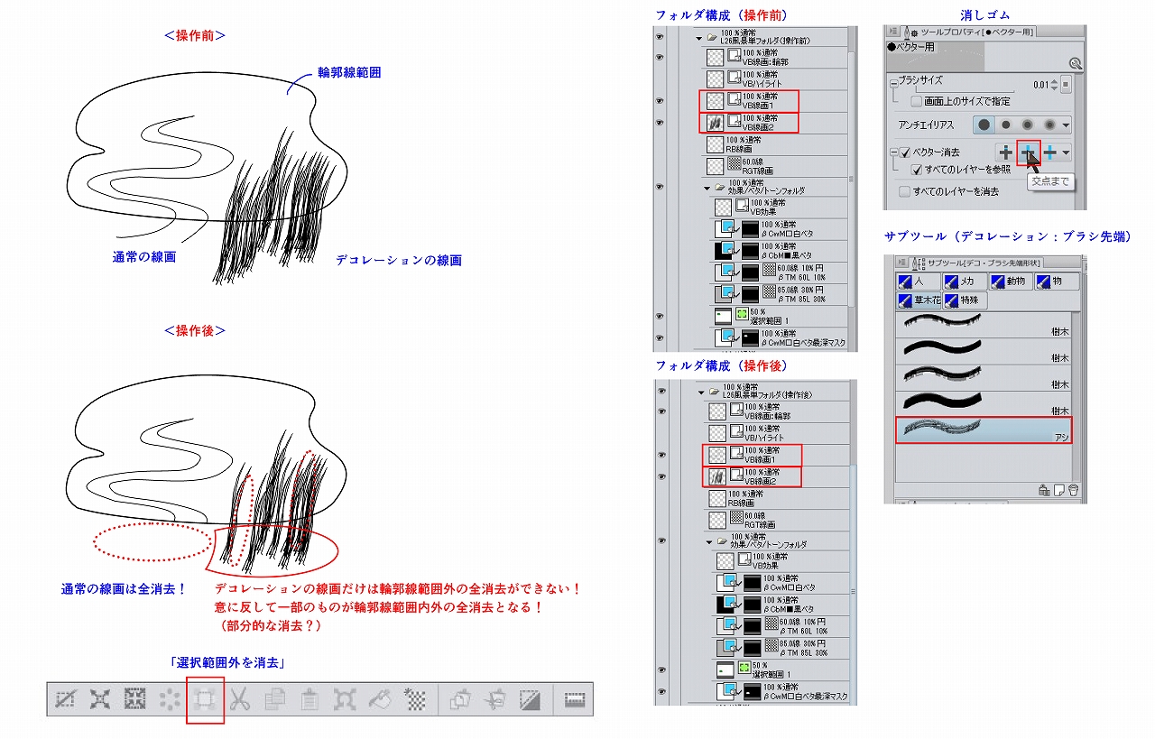 ドット単位での消去を行う場合はラスターレイヤーを使うか、レイヤーマスクを