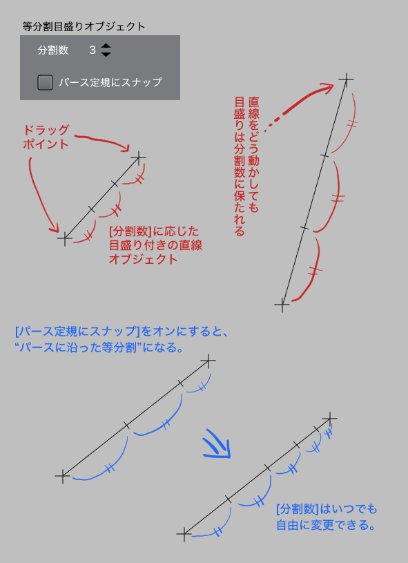 背景や建築物等を描く際に、ある幅を等分割する目安がほしい場合がよくあります。 そんな時に「こんなツールがあればいいのになぁ〜」と思う機能の要望です。