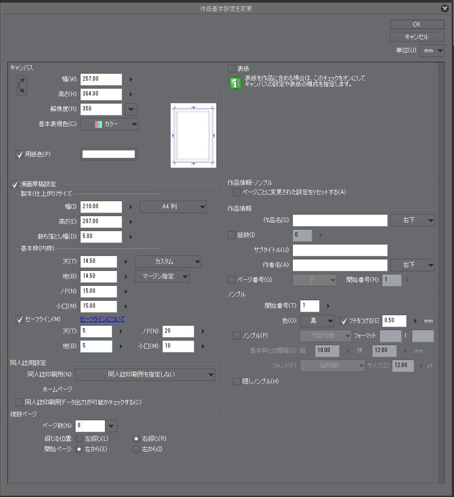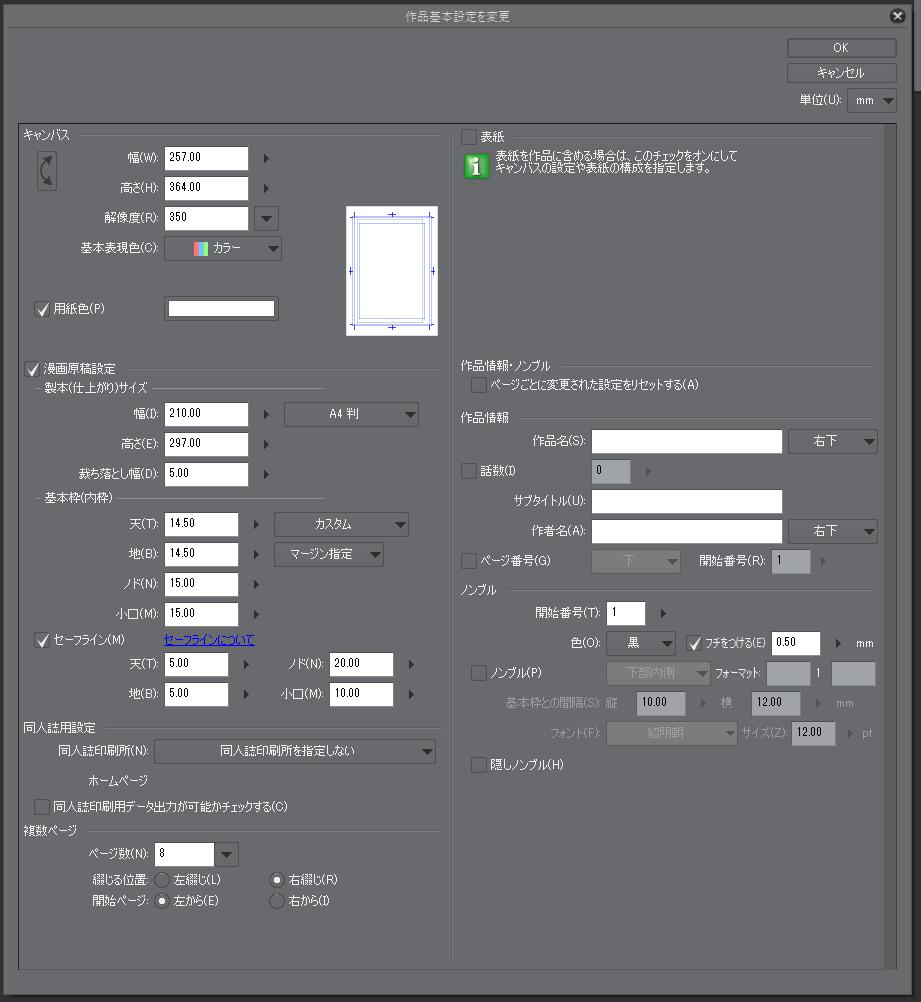 [ページ管理]メニューの[作品基本設定を変更]を選択して、