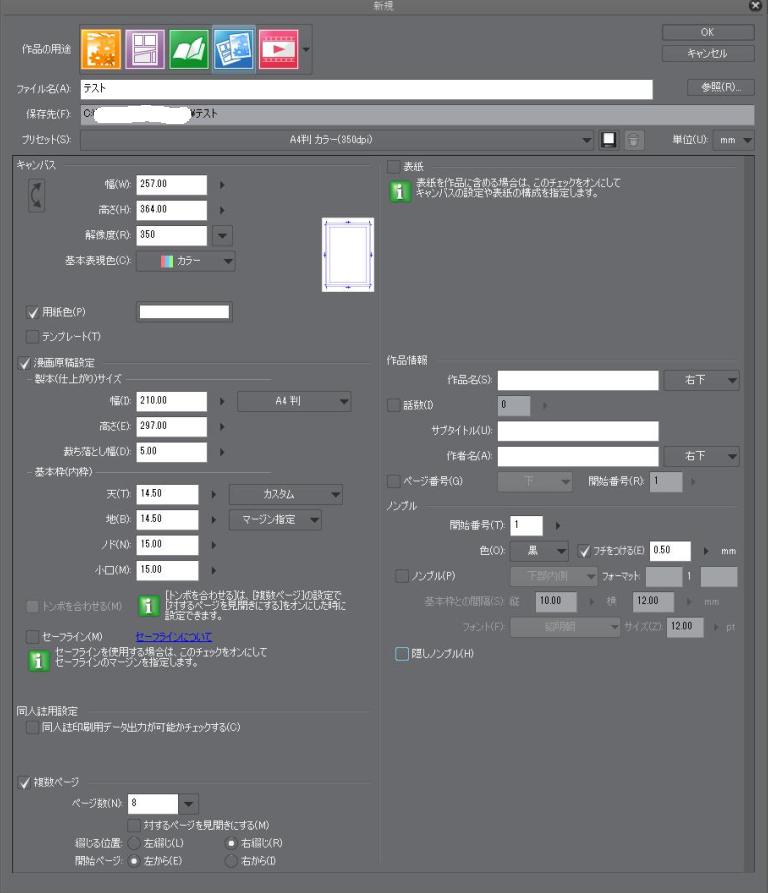 で[A4判 カラー(350dpi)]を選択して、ページ数は8ページと