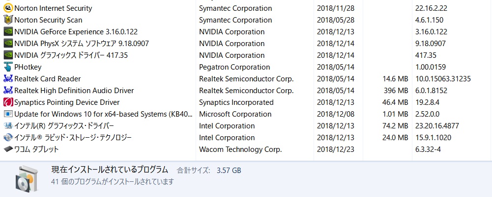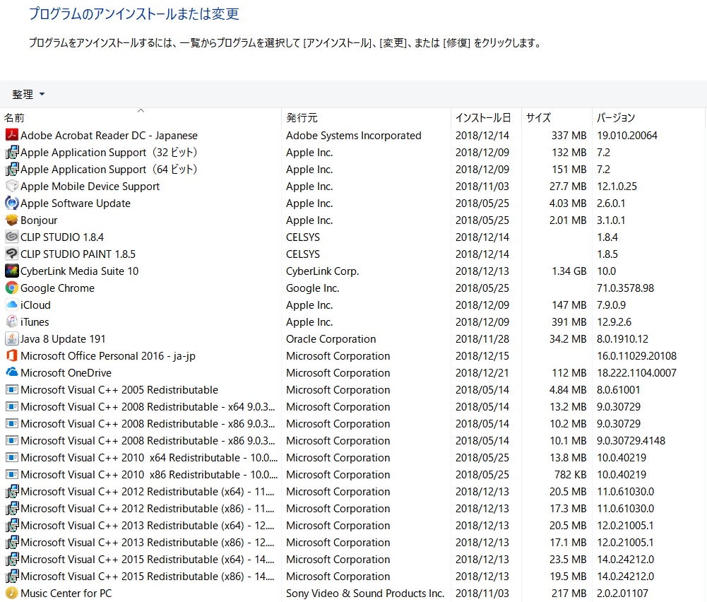 (プログラムと機能)]を選択して表示される画面のすべての項目が