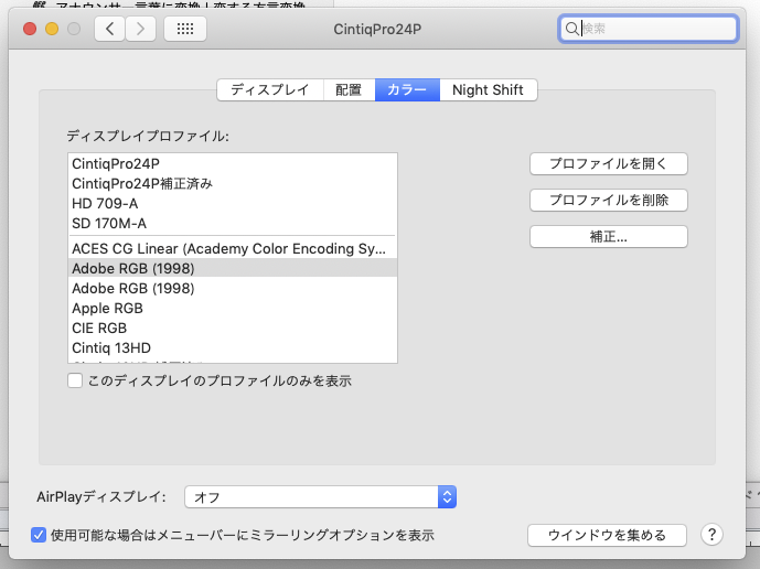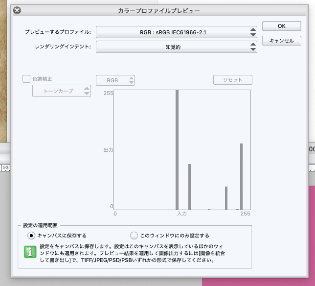 ・[表示]メニュー→[カラープロファイル]→[プレビュー設定]を選択して表示