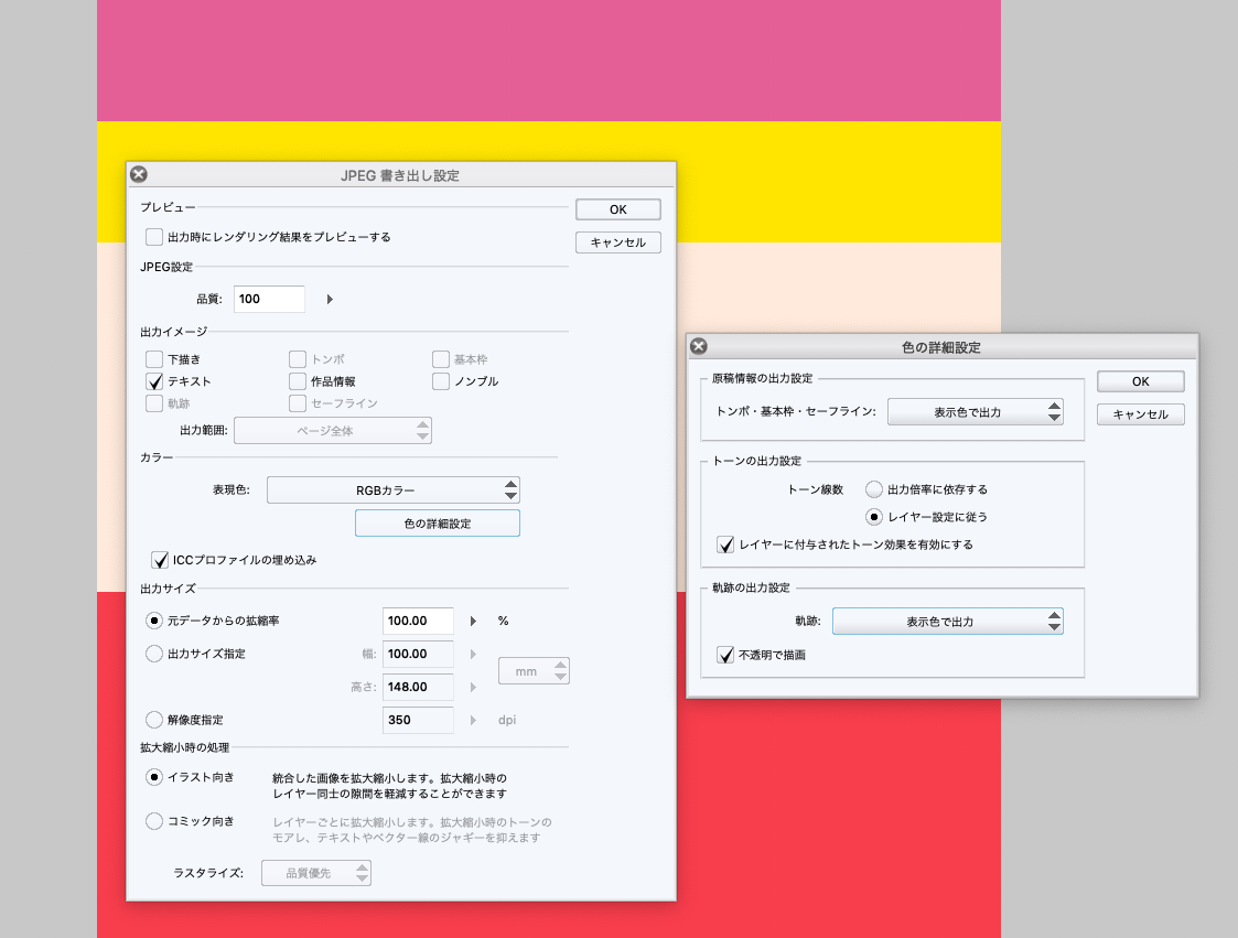 ・書き出した際のファイル形式と、書き出し時の書き出し設定画面の