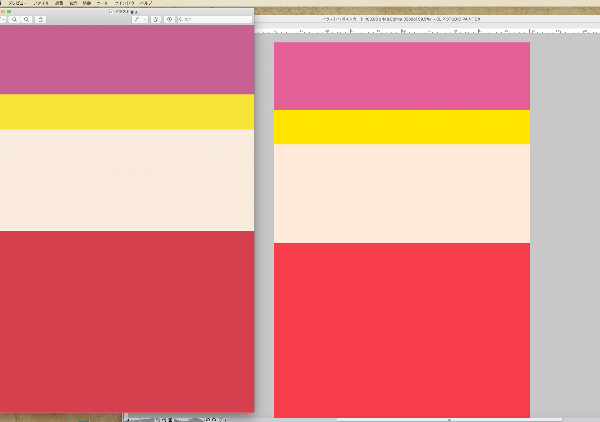 液タブでのクリスタ作業で色味が鮮やかすぎて困っています。 書き出しした時の正確なカラーに近く、そのカラーで作業したいのですが、 オンにしたままの状態で作業するにはどうしたらよいでしょうか? また、デスクトップの別モニターで表示すると正常なカラー(書き出し時のカラー)になります。 かなり色々試してみましたがこちらが解決に近いかなと思うので 何卒よろしくお願いいたします。 ------------------------------------------------------------ ■バージョン: ※Windows/MacOSXは、右上の[?]アイコンをクリック後に[バージョン情報]で確認できます。 ※iPadは、PAINTの[CLIP STUDIO PAINT]アイコンをクリック後に[バージョン情報]で確認できます。 ■OS Windows 7 ( ) Windows 8( ) Windows 8.1( ) Windows 10( ) MacOS X 10.10( ) MacOS X 10.11( ) macOS 10.12( ) macOS 10.13( ) macOS 10.14( ● ) iOS 11( ) iOS 12( ) その他( ) ------------------------------------------------------------ |