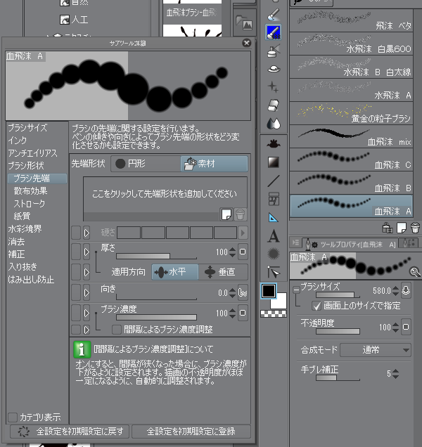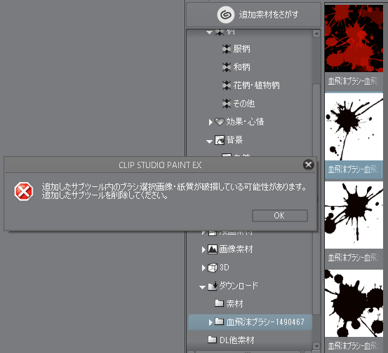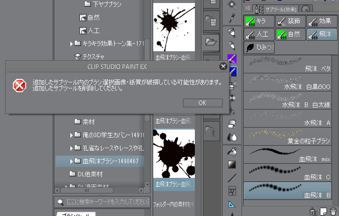 お世話になっております。 内蔵HDDを新調し移行してから一部のブラシが●になってしまい利用できなくなりました。 同じような問答がありましたので、こちらを参考に対処してみましたが解決には至りませんでした。 (https://www.clip-studio.com/clip_site/support/request/detail/svc/54/tid/95492) ![]() 最終的にシフトを押しながらCRIP STUDIO PAINTを起動しツール・ブラシ形状・ブラシサイズを初期化して素材管理も初期の状態に戻したのですが、やはり一部のブラシは素材を再ダウンロードしてサブツールに登録しても●でしか使用できず、「サブツール詳細」のブラシ先端から先端形状の素材を探してみても該当する「ブラシ先端形状」が無い状態です。 ![]() ![]() 急ぎの用件ではないのですが不具合が解決できますようよろしくお願いします。 ------------------------------------------------------------ ■バージョン: ※Windowsは、[ヘルプ]メニュー → [バージョン情報]で確認できます。 ※MacOSXは、[CLIP STUDIO PAINT]メニュー → [バージョン情報]で確認できます。 ※iPadは、[CLIP STUDIO PAINT]アイコン → [バージョン情報]で確認できます。 ■グレード DEBUT( ) PRO( ) EX( ○ ) Ver.1.8.5 (2019/02/02時点) ■OS Windows XP( ) Windows Vista( ) Windows 7 ( )Profrssional Windows 8( ) Windows 8.1( ) Windows 10( 〇 ) MacOS X 10.5( ) MacOS X 10.6( ) MacOS X 10.7( ) MacOS X 10.8( ) MacOS X 10.9( ) MacOS X 10.10( ) MacOS X 10.11( ) mac OS 10.12( ) mac OS 10.13( ) iOS 11( ) その他( ) デスクトップ型自作PC(asus H97pro / core i5 / NVIDIA GeForce640 / メモリ16GB) 新調した内蔵HDD(WESTERN DIGITAL WD30EZRZ-00GXCB08 3TB) ------------------------------------------------------------ セキュリティソフト:ウイルスバスタークラウドVer.15.0.1212 ネット環境:光回線(有線) |