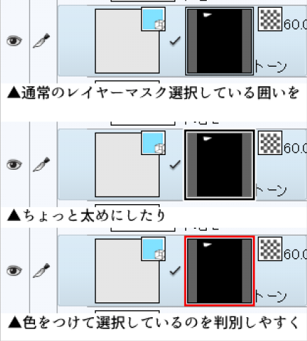 レイヤーマスクや画像レイヤー等を選択してる時、選択されていると枠が二重になる(囲いが付く)のですが、それを太くしたり色をつけたりと、パッと見で選択しているのが分かりやすくする方法(設定)はありますか?![]() ------------------------------------------------------------ ■バージョン: ※Windowsは、[ヘルプ]メニュー → [バージョン情報]で確認できます。 ※MacOSXは、[CLIP STUDIO PAINT]メニュー → [バージョン情報]で確認できます。 ※iPadは、[CLIP STUDIO PAINT]アイコン → [バージョン情報]で確認できます。 ■グレード DEBUT( ) PRO( ) EX( ○ ) ■OS Windows 7 ( ) Windows 8( ) Windows 8.1( ○ ) Windows 10( ) MacOS X 10.10( ) MacOS X 10.11( ) macOS 10.12( ) macOS 10.13( ) macOS 10.14( ) iOS 11( ) iOS 12( ) その他( ) ------------------------------------------------------------ |
