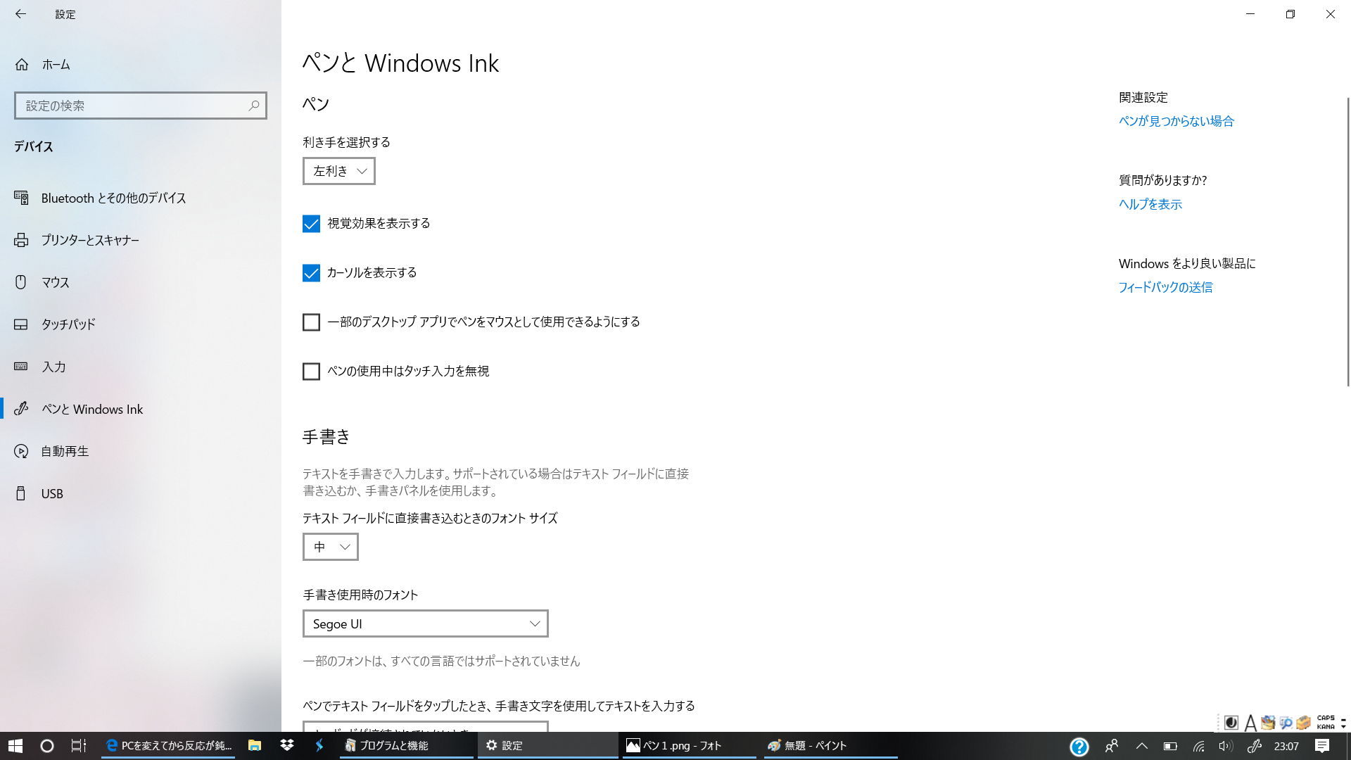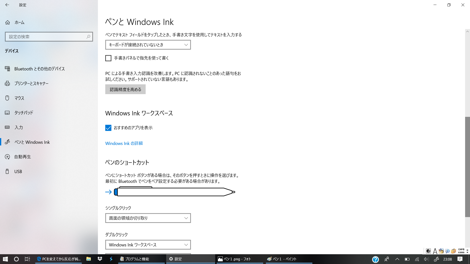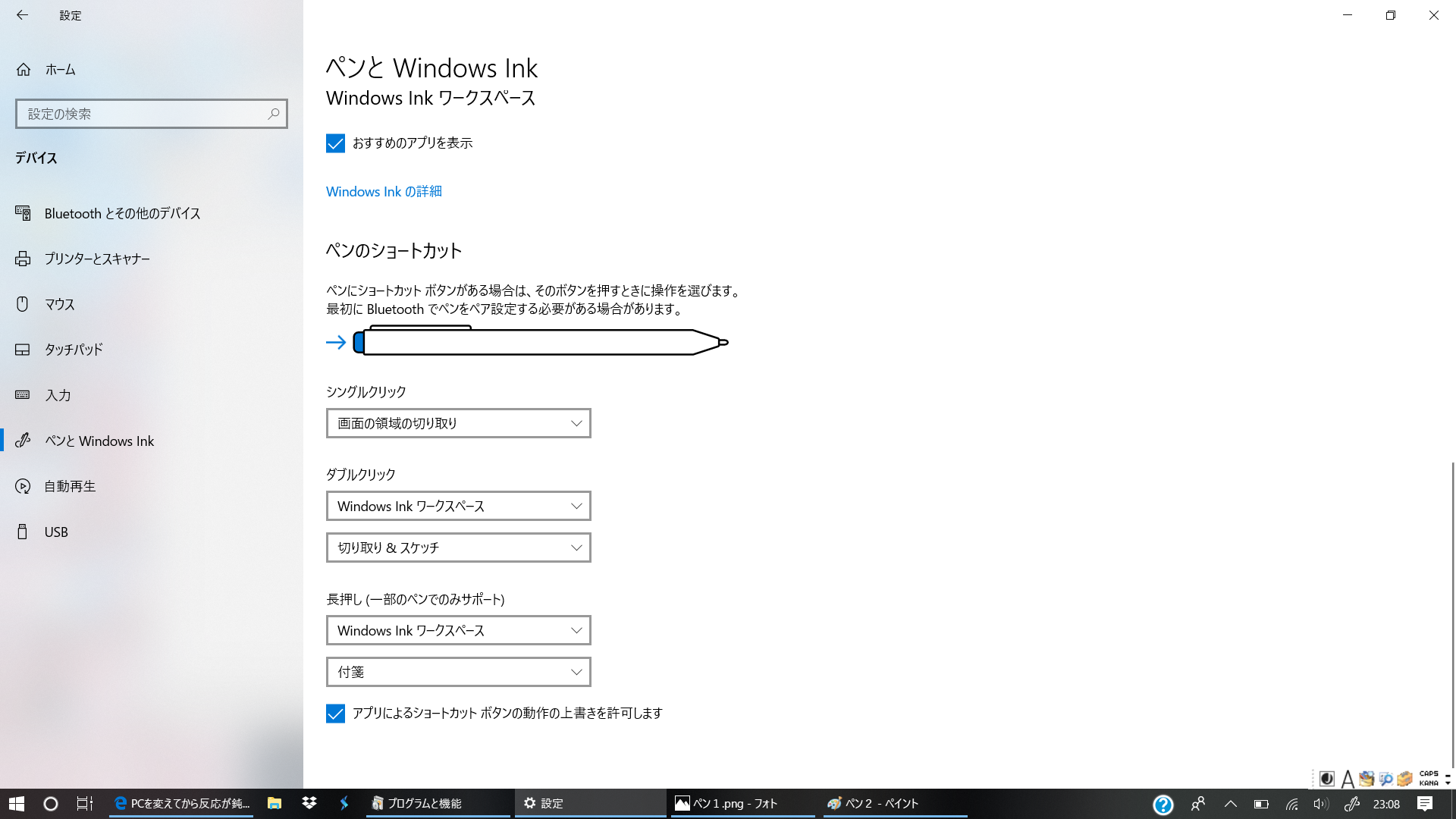 左側で[ペンとWindows Ink]の順に選択すると表示されるページのすべての