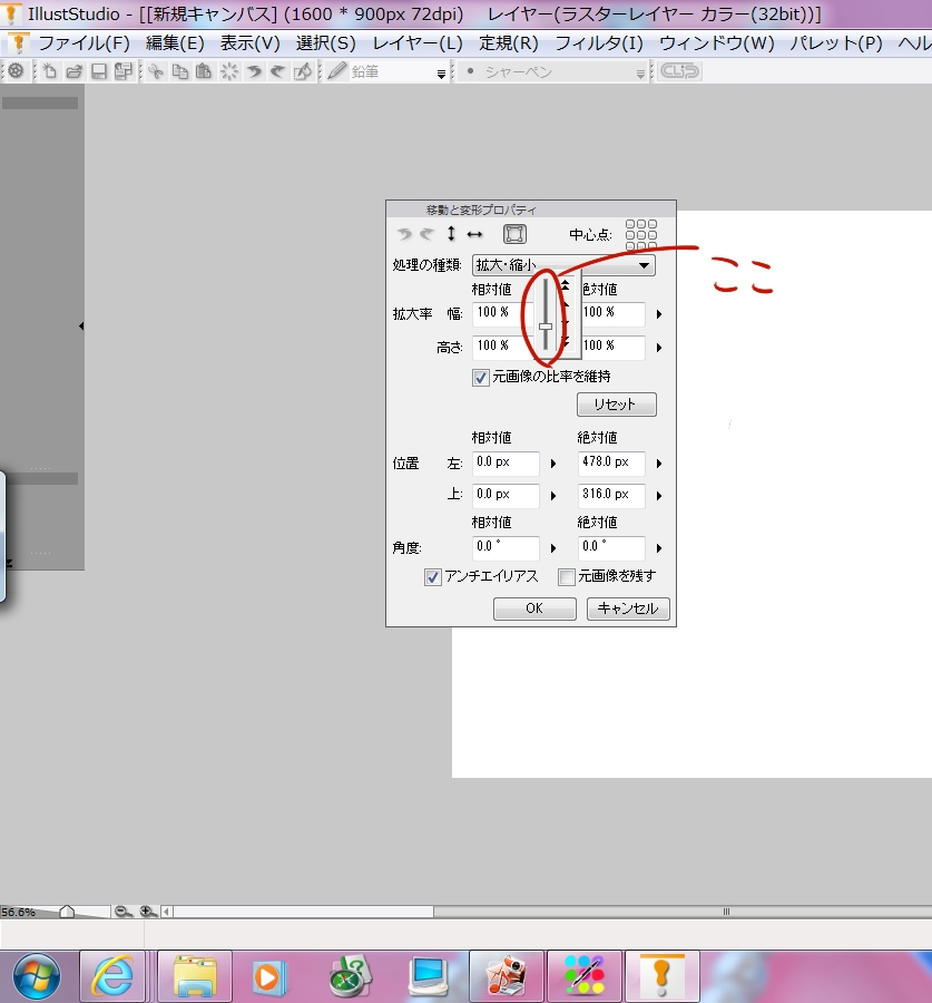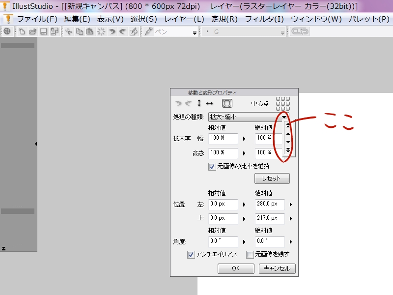 相対値は、画面に表示されている状態からの拡大率を変更する欄となり、