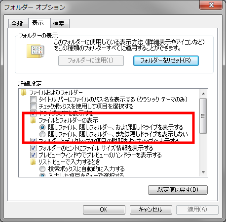 トップのカスタマイズ]→[フォルダオプション]を開き、[表示]タブの[詳細