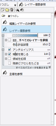 線画を描いて塗りつぶしをしたいのですが、レイヤ―を参照レイヤ―に設定したのですが、いざバケツツールを使うと塗りつぶしが全体のレイヤ―すべてに反映されてしまいます。
