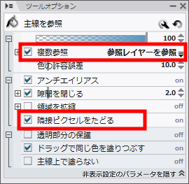 なお、塗りつぶしツールやマジックワンドのツールオプションの設定で、