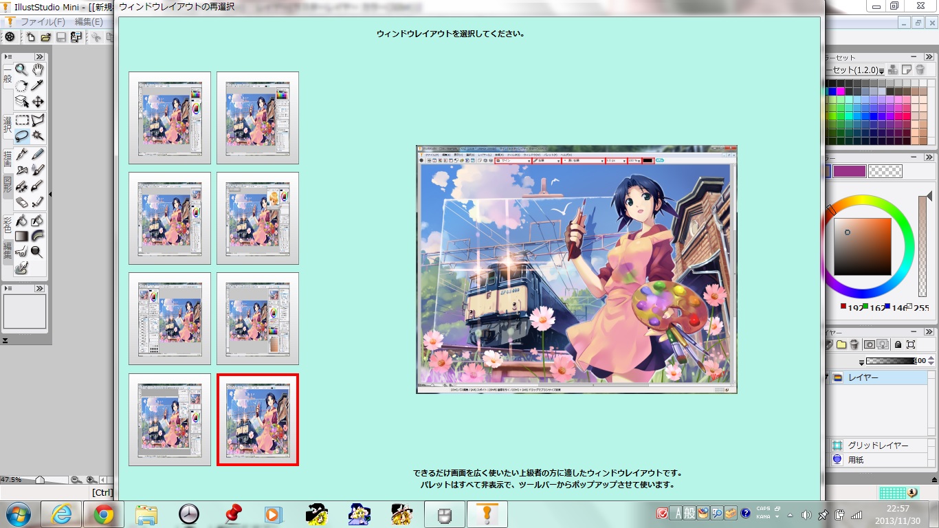 ウィンドウレイアウトの再選択がしたいのですが、レイアウトを選ぶ画面が大きくて選択するボタンが見えなくなっています。 上にずらそうとしてもできないのでレイアウトが変えられません。 この画面を小さくする方法はありませんか? ![]() --------------------------------------------------------- ■IllustStudio IllustStudio( ) IllustStudioMini( ○ ) バージョン:1.2.7 ※[ヘルプ]メニュー→[バージョン情報]で確認できます。 ■OS Windows XP( ) Windows Vista( ) Windows 7 ( ○ ) Windows 8( ) Windows 8.1( ) その他( ) --------------------------------------------------------- |