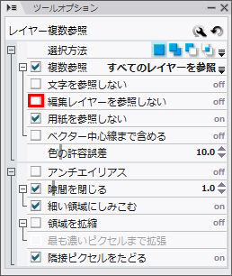 以外の[編集レイヤーのみ参照][主線を参照][同じ色を選択]をそれぞれ選択して、