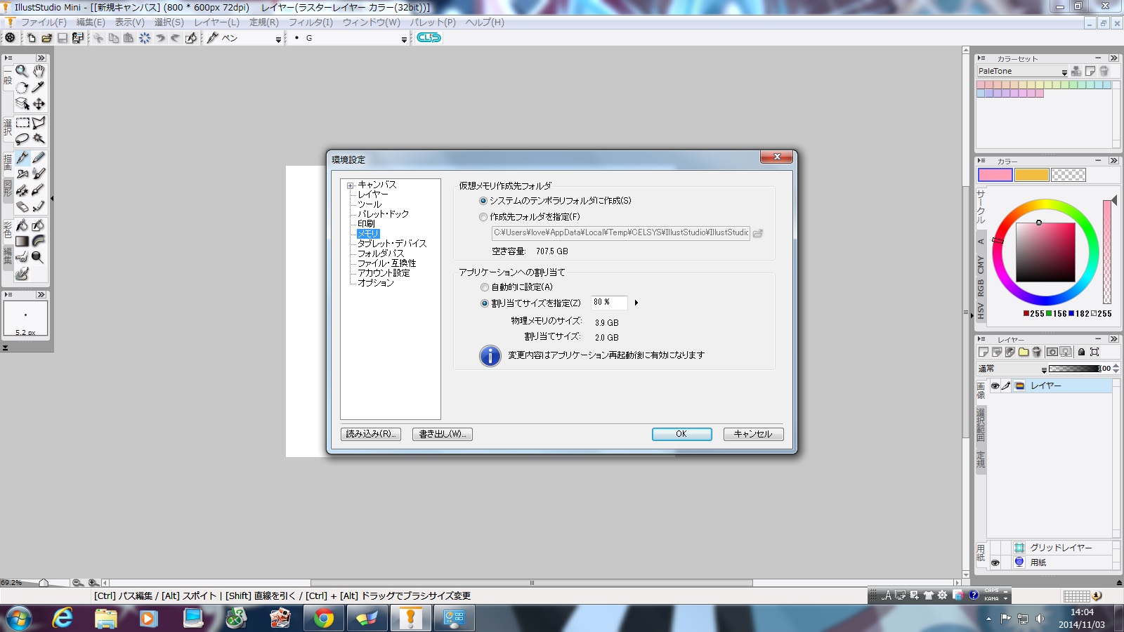 こんばんは。 夜分に失礼いたします。 先日から、illuststudio Mini(ワコムのペンタブを購入した際に ついていたディスクをインストールして使っています)で とあるイラストを描いていたのですが、 保存をしようとしても 「このコマンドを実行するのに十分な記憶域がありません」 という表示が出てきてしまい、xpg形式で保存ができなかったり、 また、そのイラストの作業を進めようとすると その絵の一部分だけ消しゴムでタッチすると同様のメッセージが 表示され(他の部分では今のところそのようなことはありませんでした) 直したい部分の作業をすることができなかったりします。 最近では、その作業すらも重すぎてやりにくく、 メッセージが表示され仕方なくアプリを閉じる際に 閉じる動作自体が大変重く、左右のパレットが 消えてしまい(次にアプリを開くときにウインドウレイアウトを初期化して 元に戻しています)、アプリが閉じずPCそのものを強制終了せざるを得ないと いった状況です。 自力でなんとかしようと、ほかの似たような質問とそれへの返信にも 目を通させていただきましたが、私自身PCに弱く 難しい用語などはわからないため、 自力でできたのは、アプリのアップデート(ver1.2.7になりました)と 環境設定→メモリ→アプリケーションへの割り当てを最大の80%にすること だけでした。 また、xpg形式の作業中の絵が保存される ピクチャ のなかのjpg、png、xpg形式のファイルを いくつか消すこともしてみました。 PCそのものの容量にはまだまだ空きがありました。 このようなケースは初めてで(レイヤーが多いと作業が重いと いうことはありましたが)、私自身どうしたら良いのかわからず この度質問させていただくことにしました。 お手数おかけしますが、お返事をいただけたら幸いです。 ■IllustStudio IllustStudio( ) IllustStudioMini( ○ ) バージョン: ※[ヘルプ]メニュー→[バージョン情報]で確認できます。 ■OS Windows XP( ) Windows Vista( ) Windows 7 ( ○ ) Windows 8( ) Windows 8.1( ) その他( ) --------------------------------------------------------- |