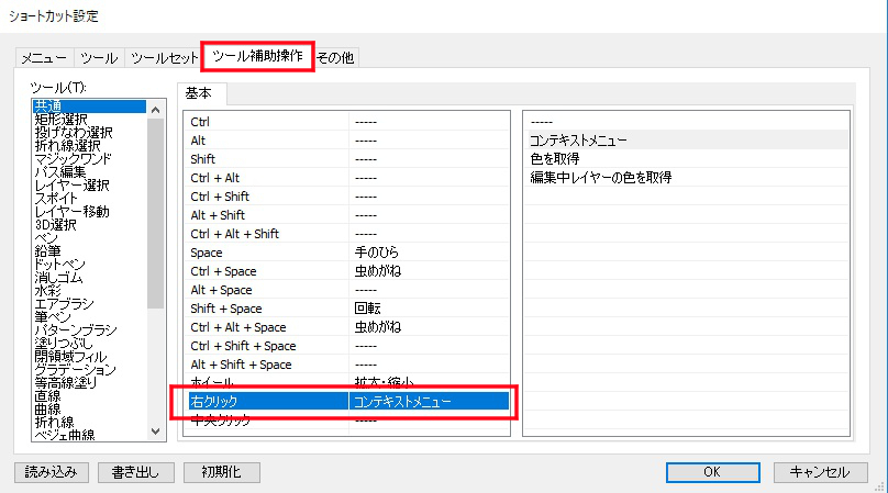 表示された画面の「ツール補助操作」タブをクリックして、右クリックの動作が